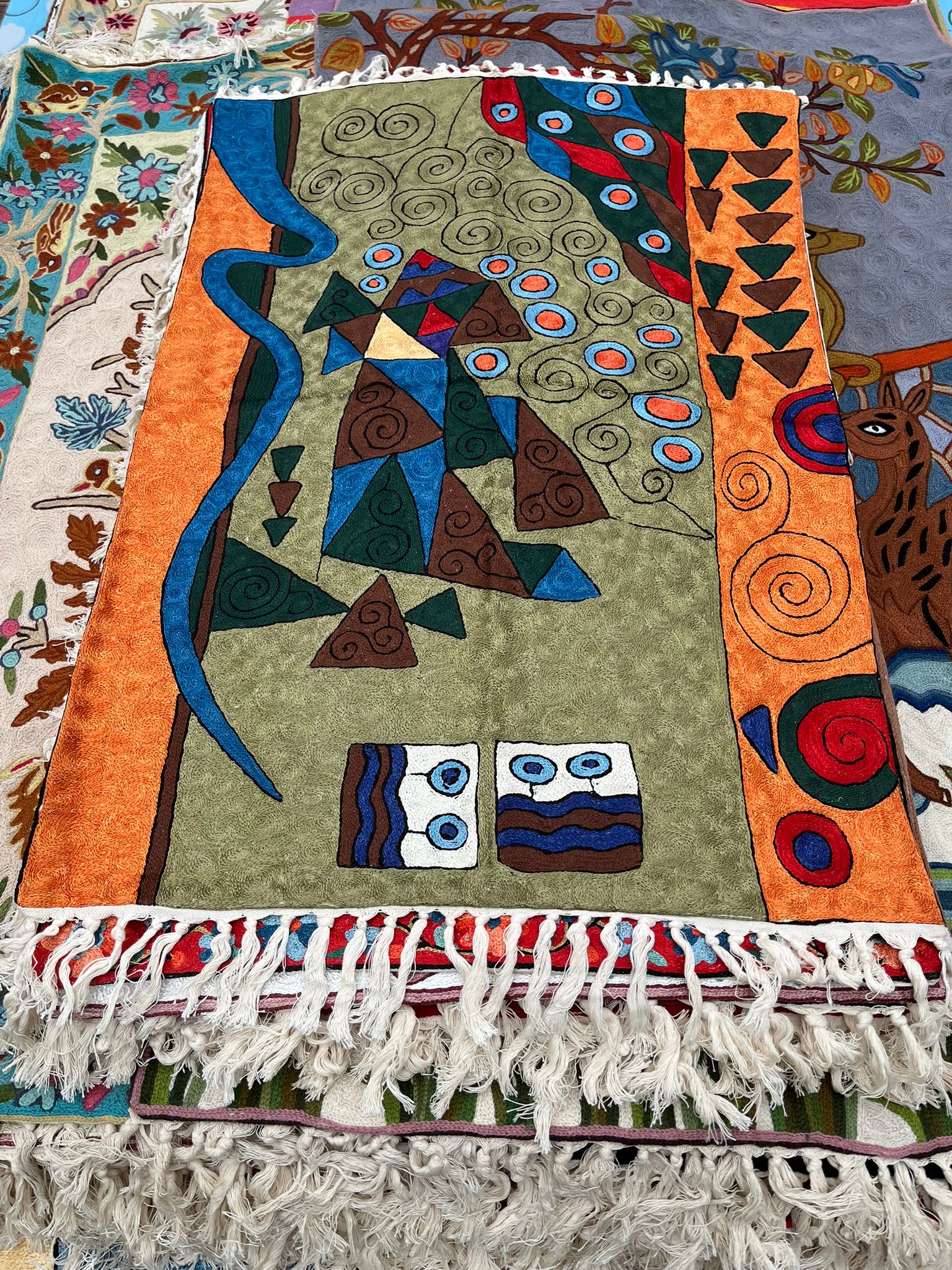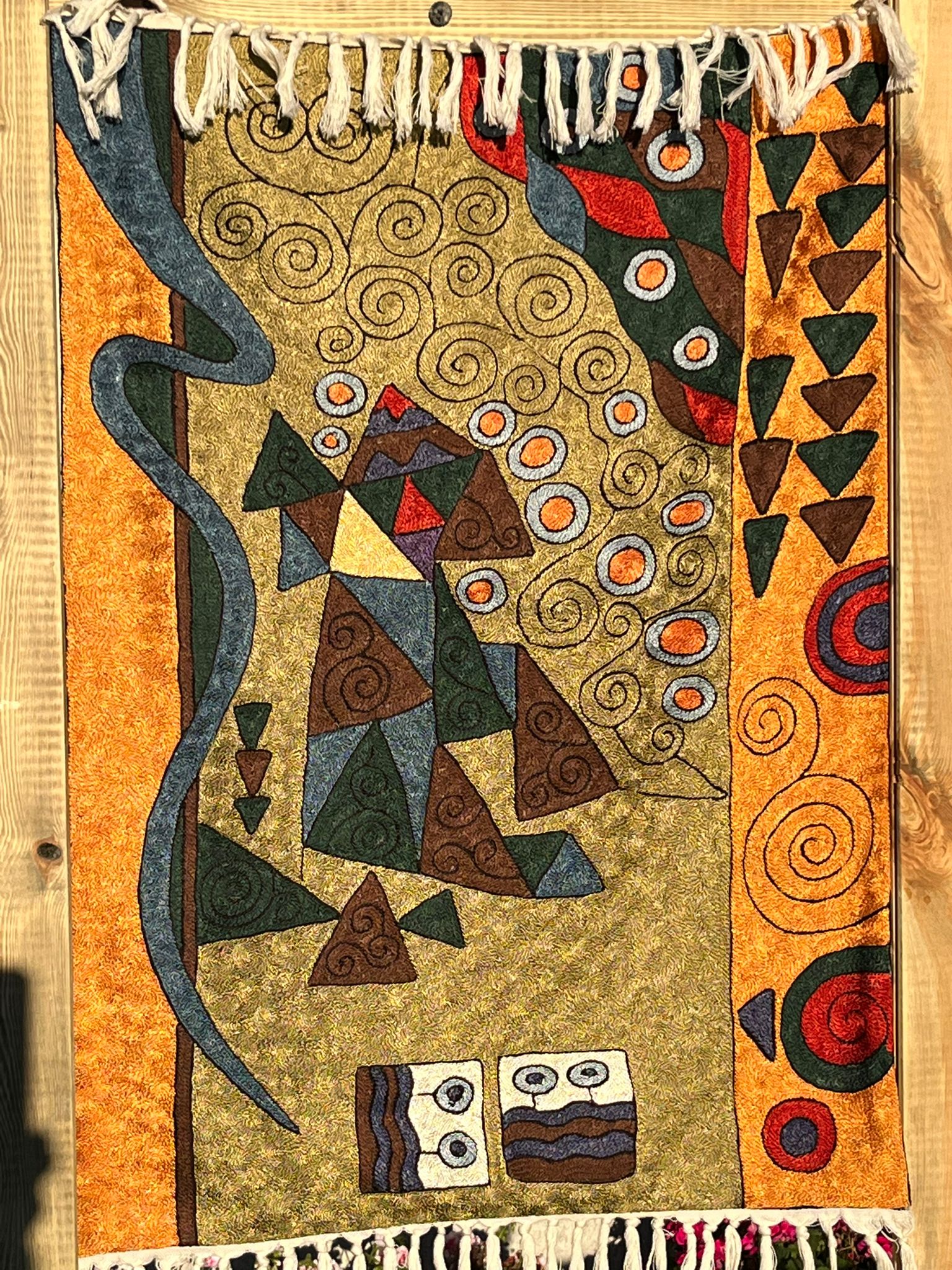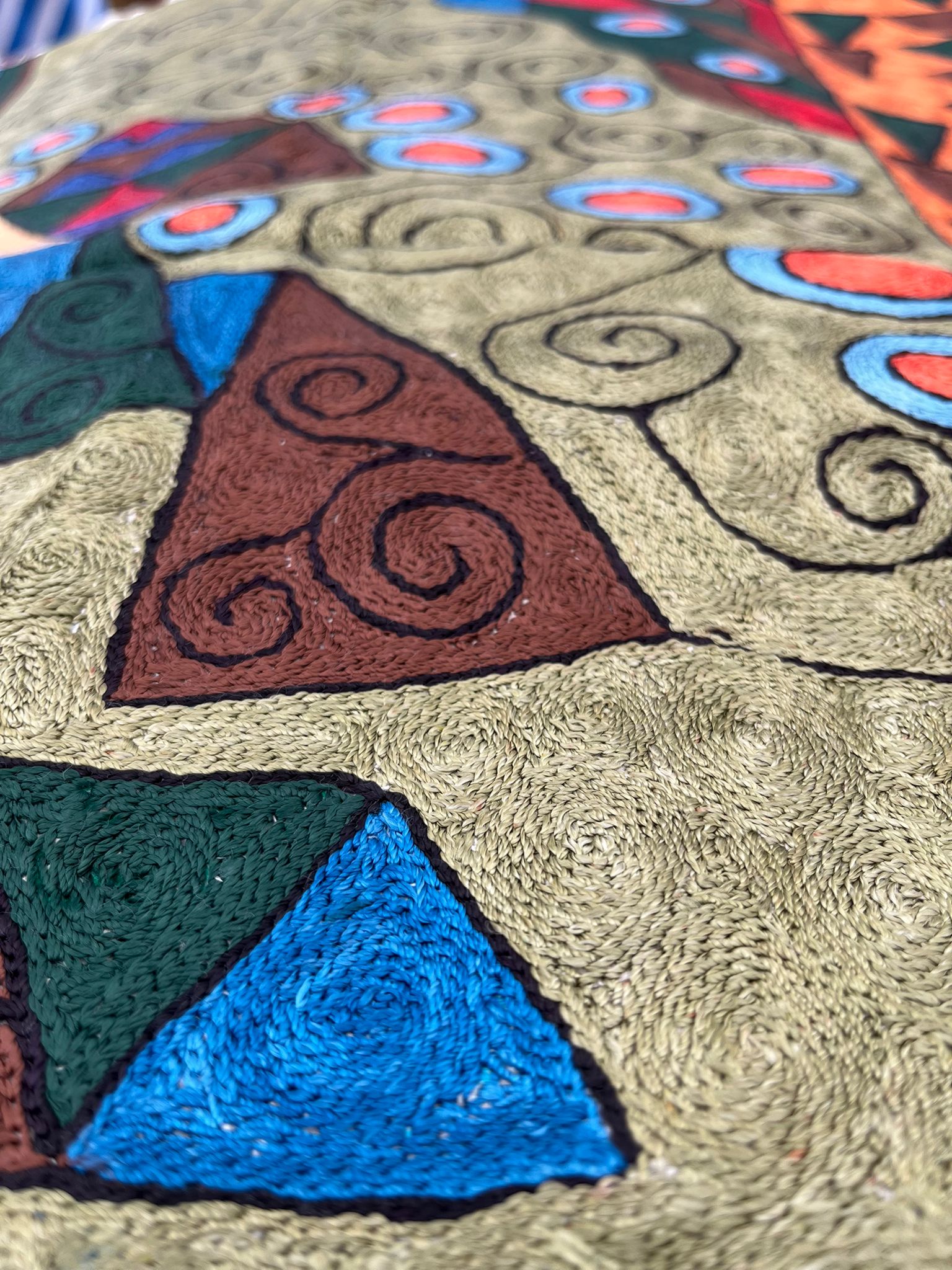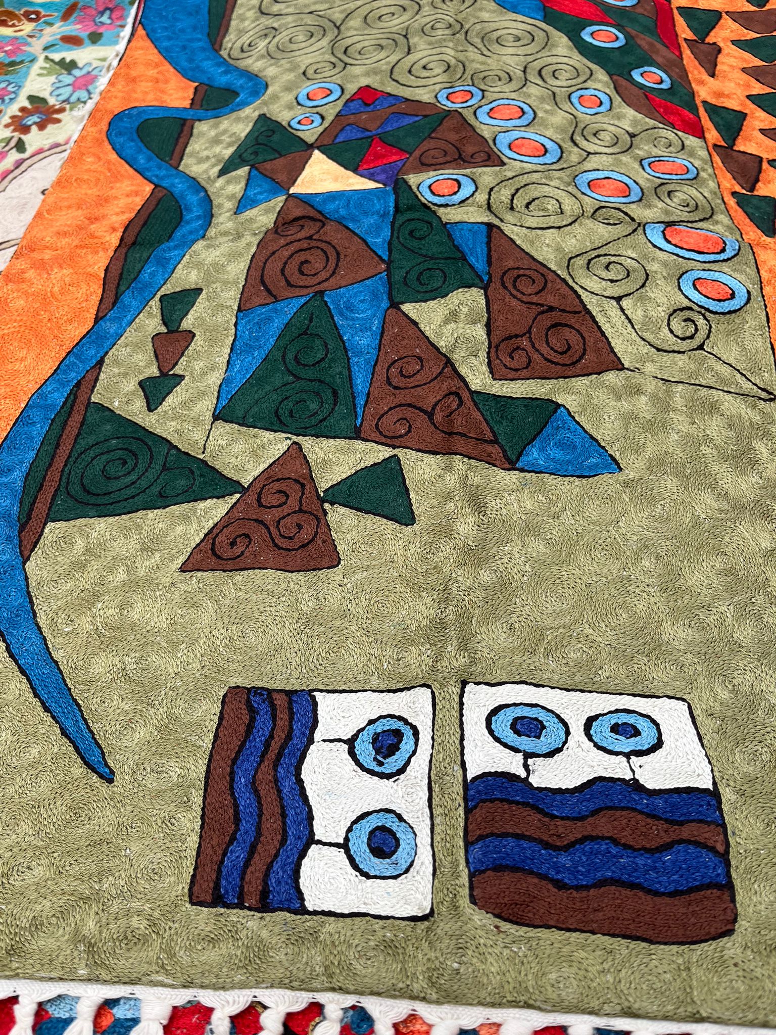 Dywan przedstawia abstrakcyjną kolorową kompozycję z elementami przypominającymi organiczne i spiralne kształty oraz figury geometryczne, co jest bardzo charakterystyczne dla tradycyjnego rękodzieła indyjskiego.