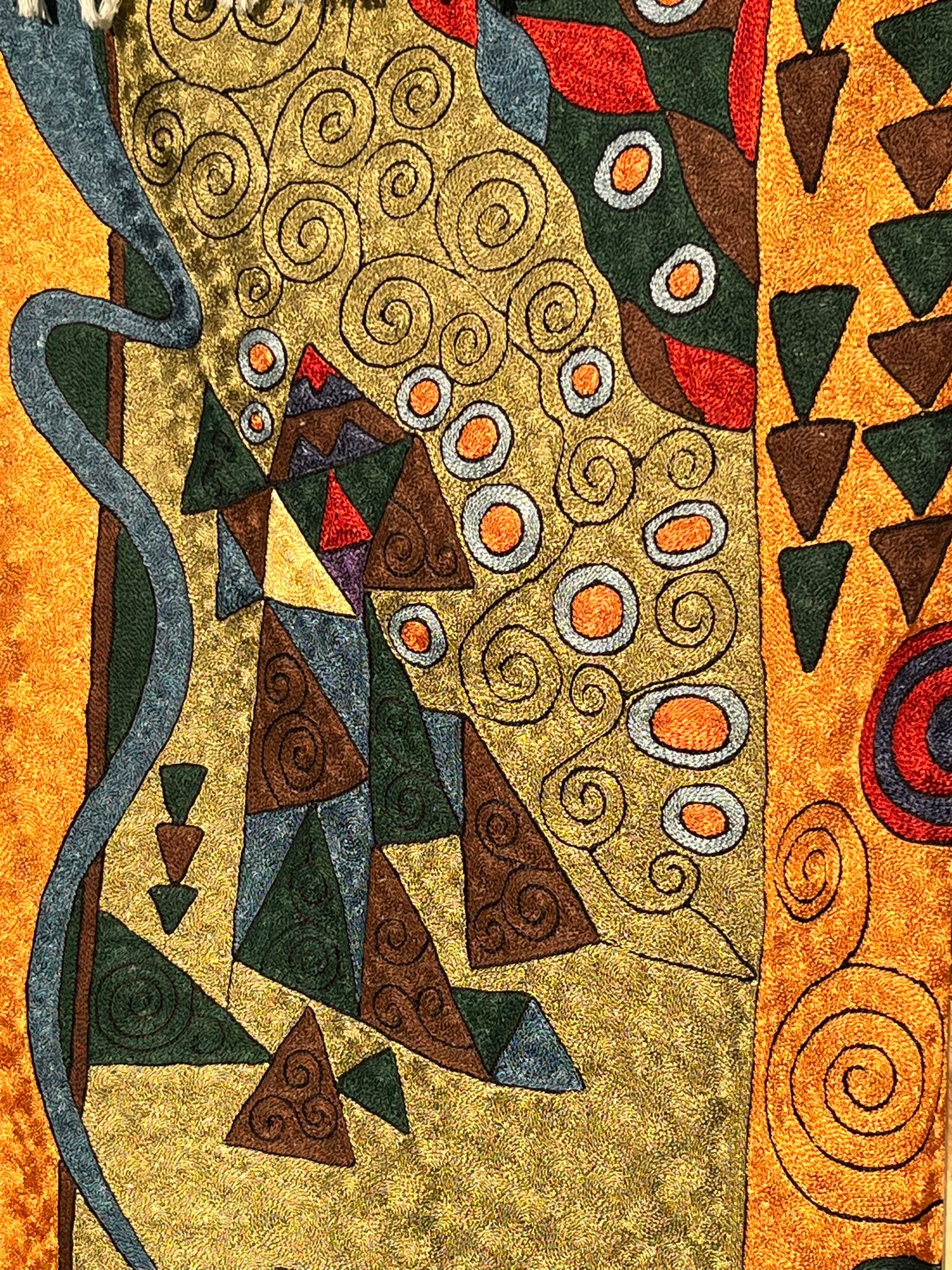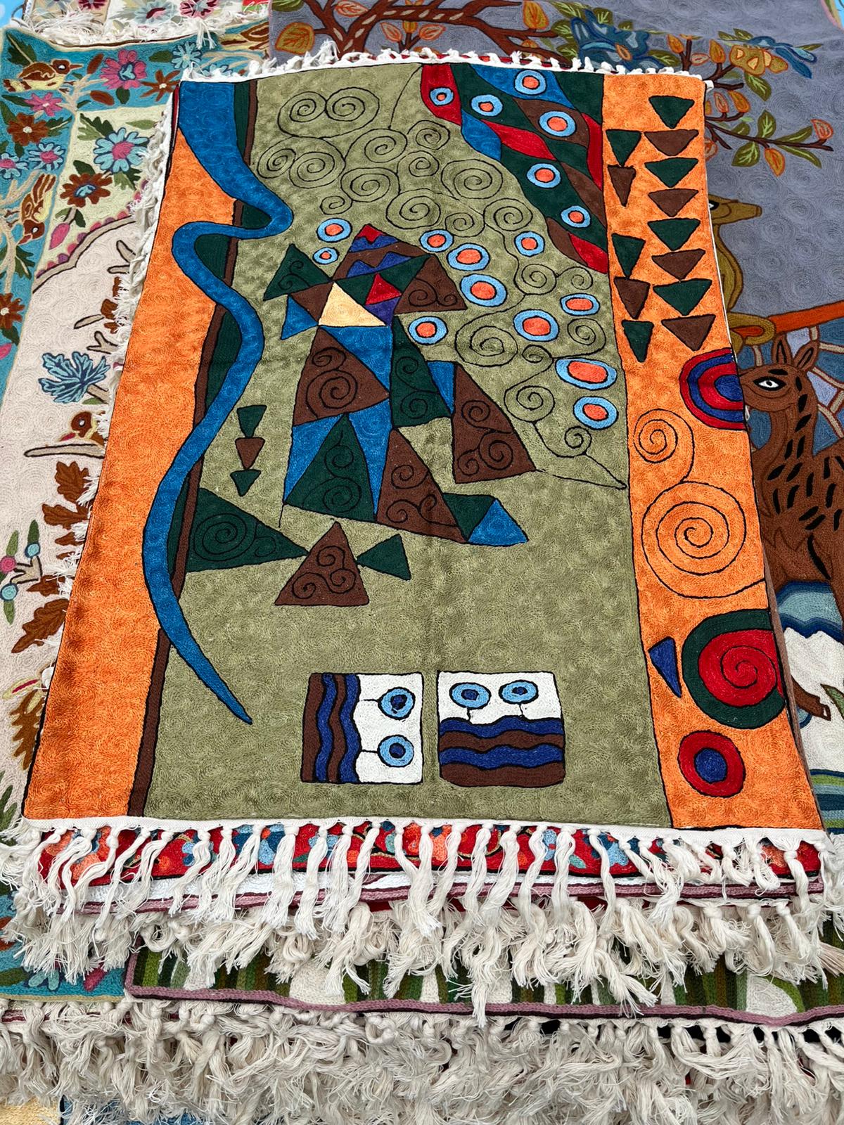 Dywan w całości wykonany ręcznie w Kashmirze, północne Indie, haftowany nicią jedwabną/ SILK, za pomocą haftu łańcuszkowego.