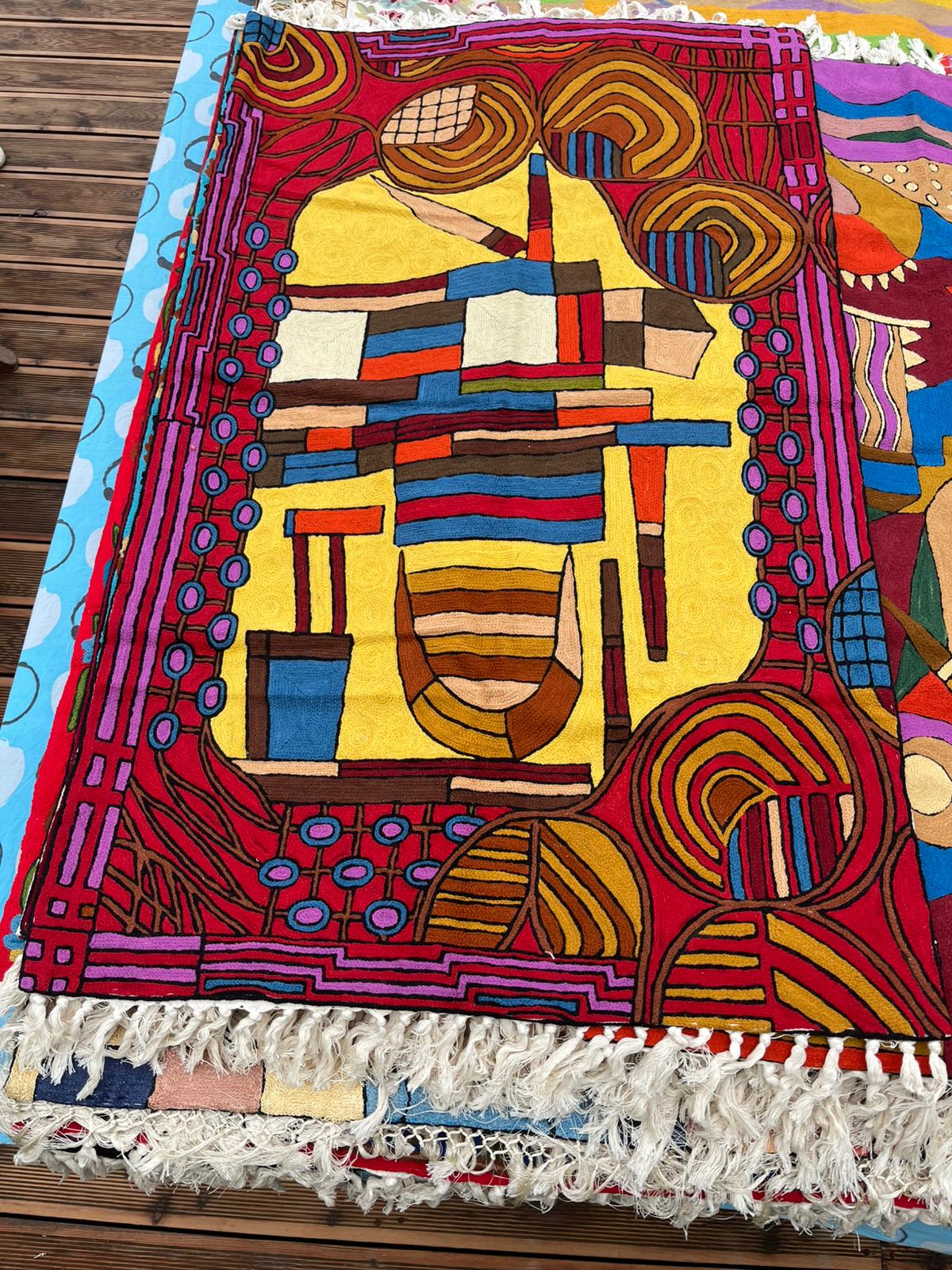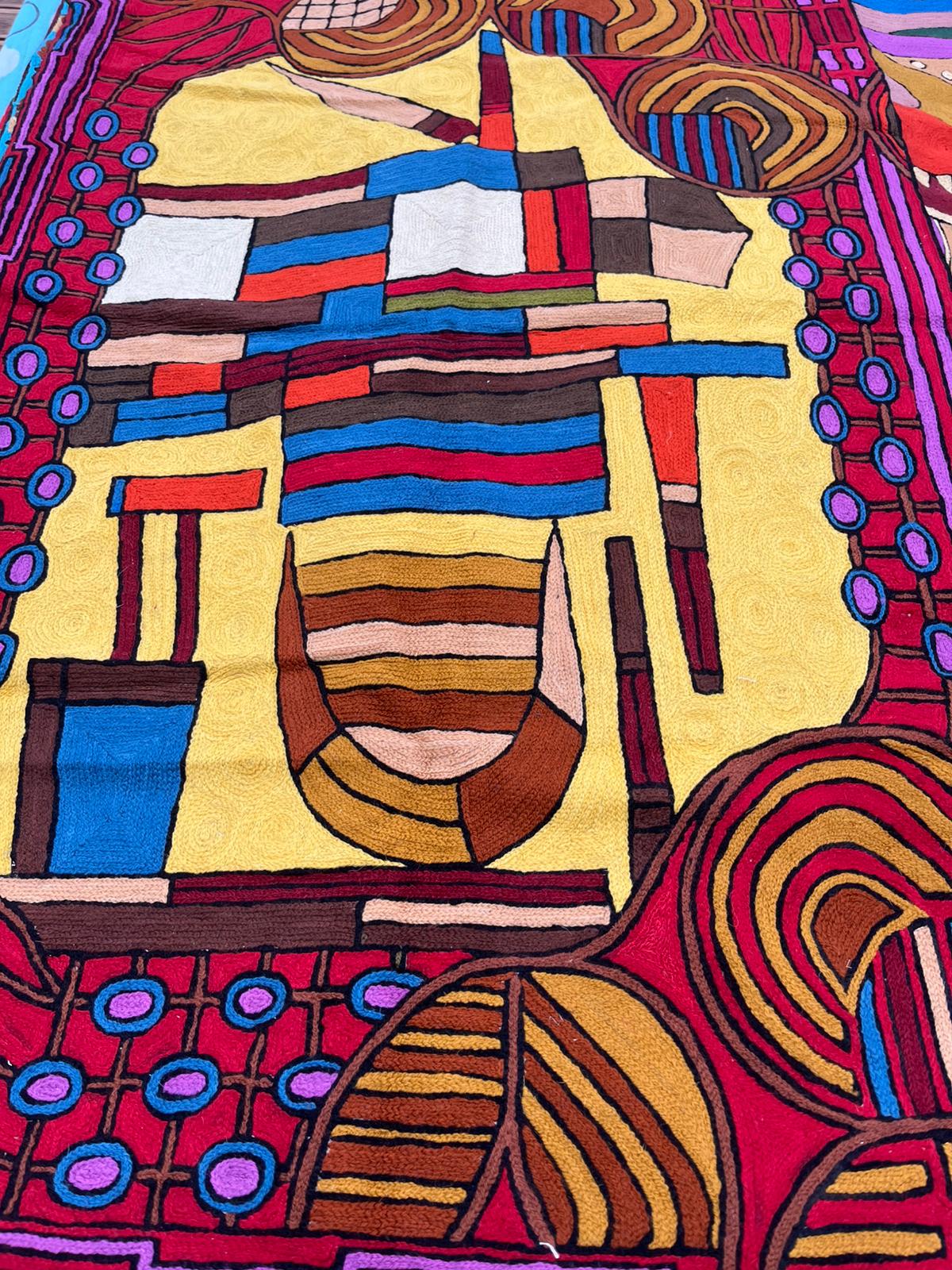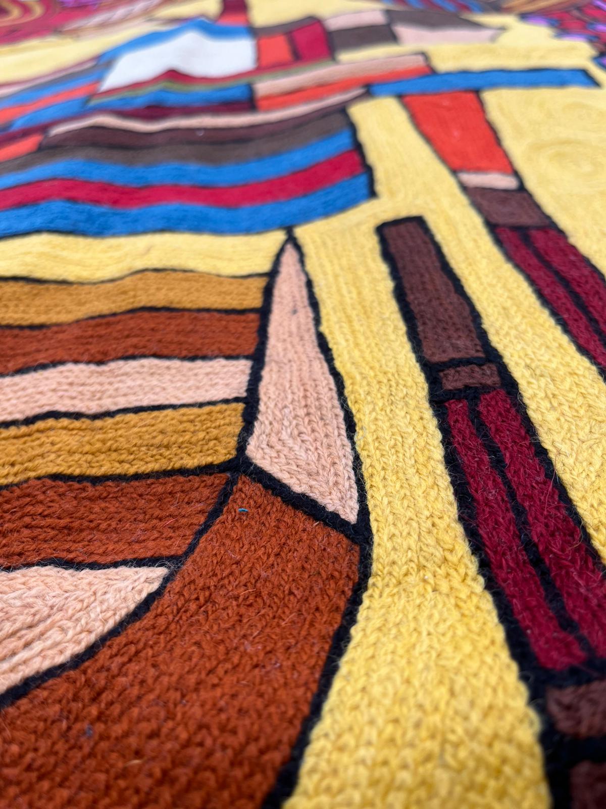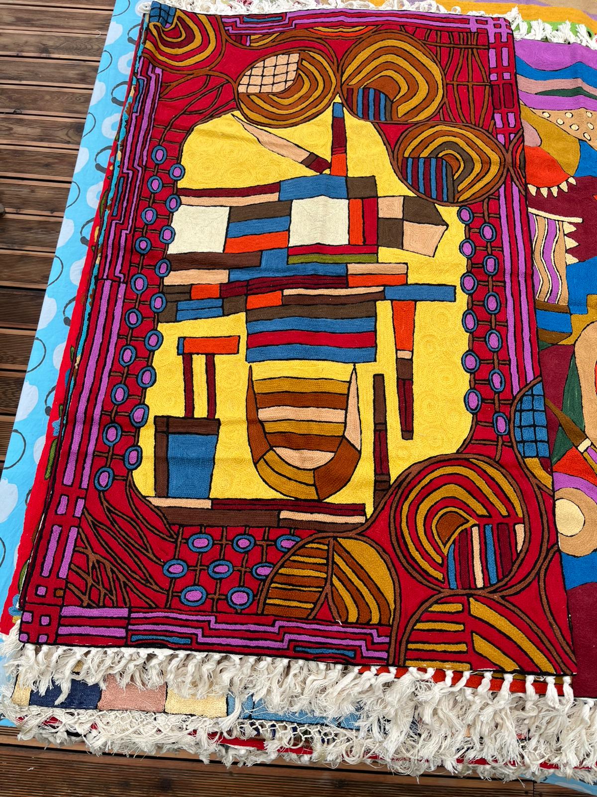 Na oferowanym przez nas dywanie kaszmirskim przedstawiony jest abstrakcyjny wzór, który składa się z geometrycznych oraz organicznych kształtów tworzących centralną kompozycję. Dominujące barwy to czerwony, fioletowy, żółty oraz brązowy. Wzór zawiera również elementy w odcieniach niebieskiego, pomarańczowego oraz kremowego, które dodają kompozycji głębi i różnorodności. Dywan cechuje się silnymi kontrastami barwnymi, zwłaszcza między intensywną czerwienią a żółtym, co nadaje mu żywy i dynamiczny charakter.