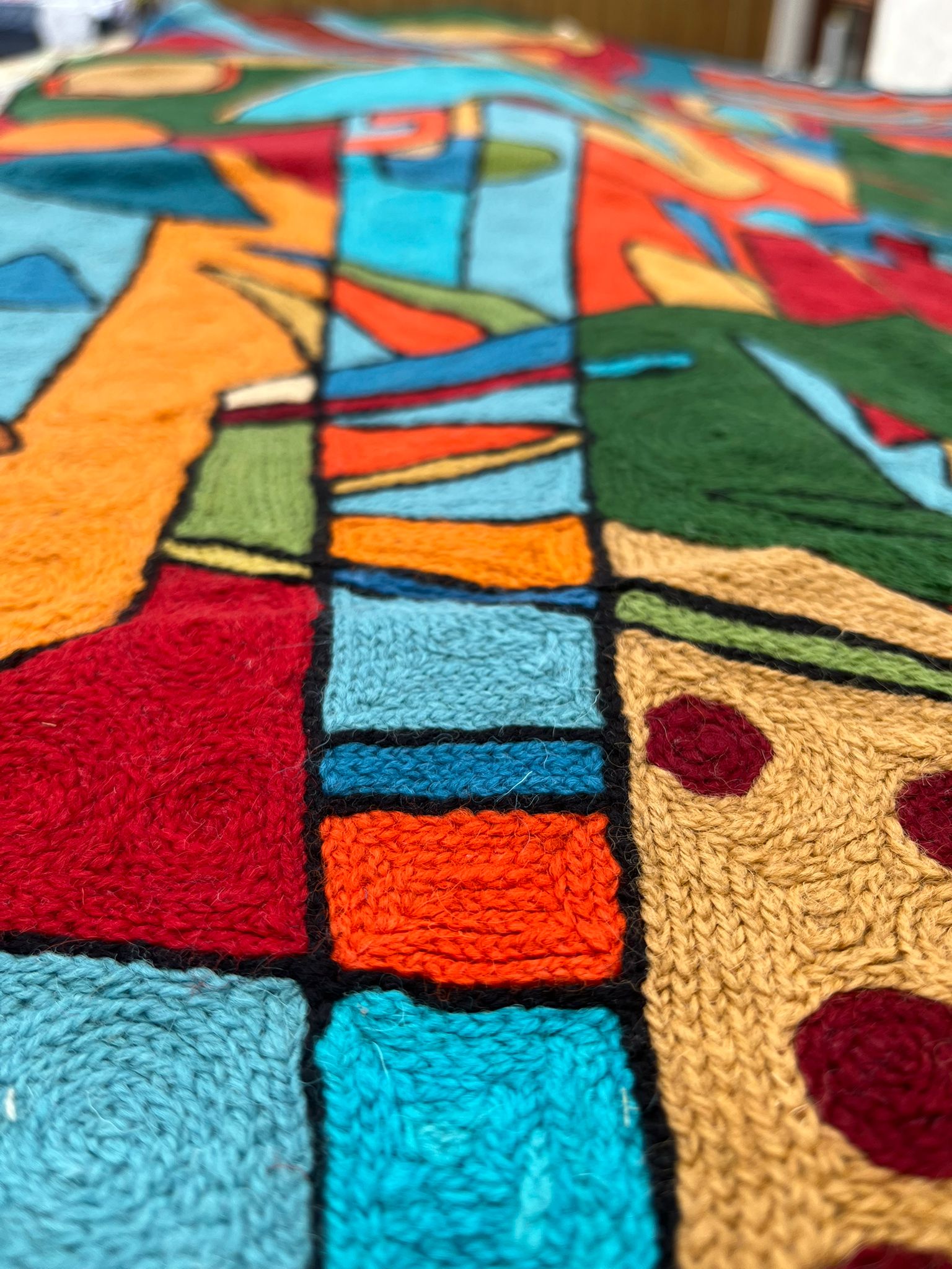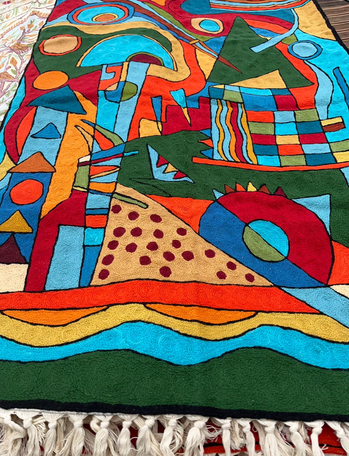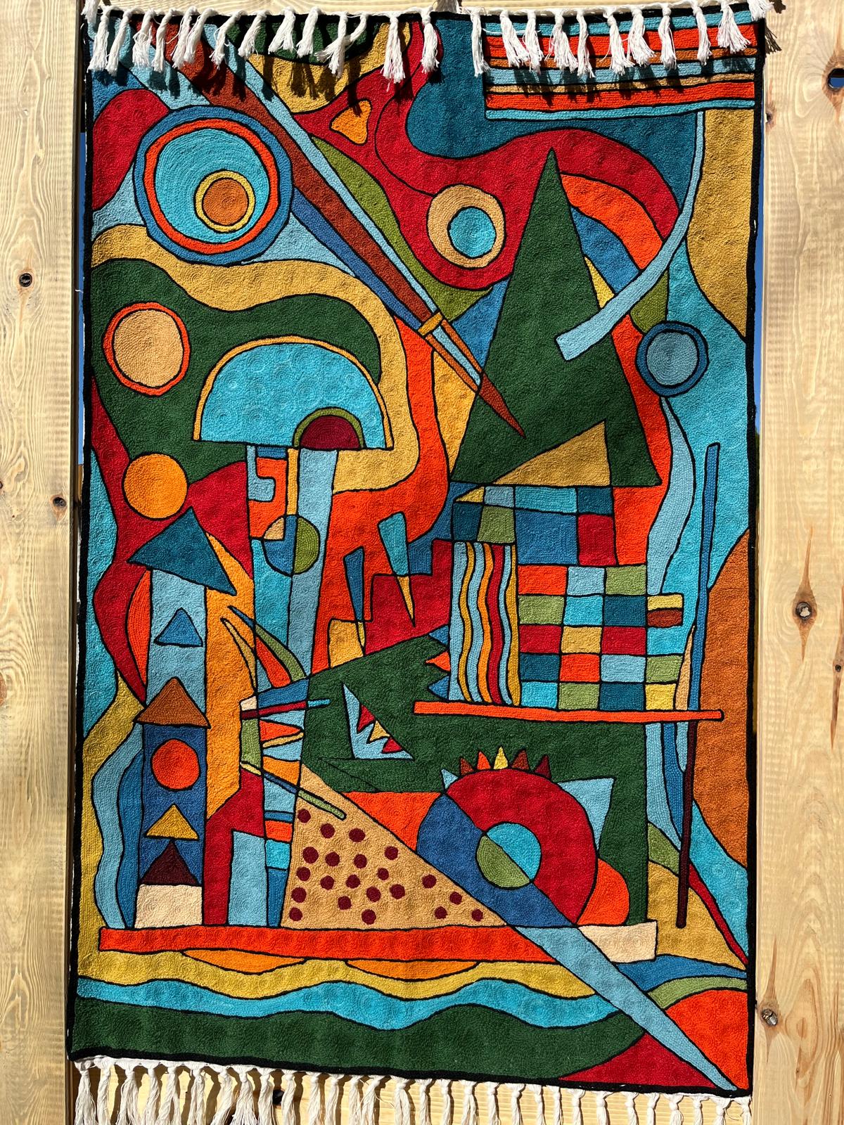 Prezentowany dywan kaszmirski przedstawia abstrakcyjną kompozycję inspirowaną stylem sztuki nowoczesnej, przypominającą dzieła Wassily'ego Kandinsky'ego. Kompozycja składa się z różnorodnych, geometrycznych i organicznych kształtów, takich jak trójkąty, koła, kwadraty i faliste linie tworząc dynamiczny i złożony wzór, będący interpretacją artystyczną. Jeśli chodzi o kolorystykę dywan charakteryzuje się bogatą i żywą paletą barw. Dominują tu odcienie niebieskiego, turkusowego, zielonego, żółtego, czerwonego i pomarańczowego. Dywan cechuje się silnymi kontrastami barwnymi, zwłaszcza między intensywną czerwienią a jasnym turkusem, co nadaje mu żywy i dynamiczny charakter.