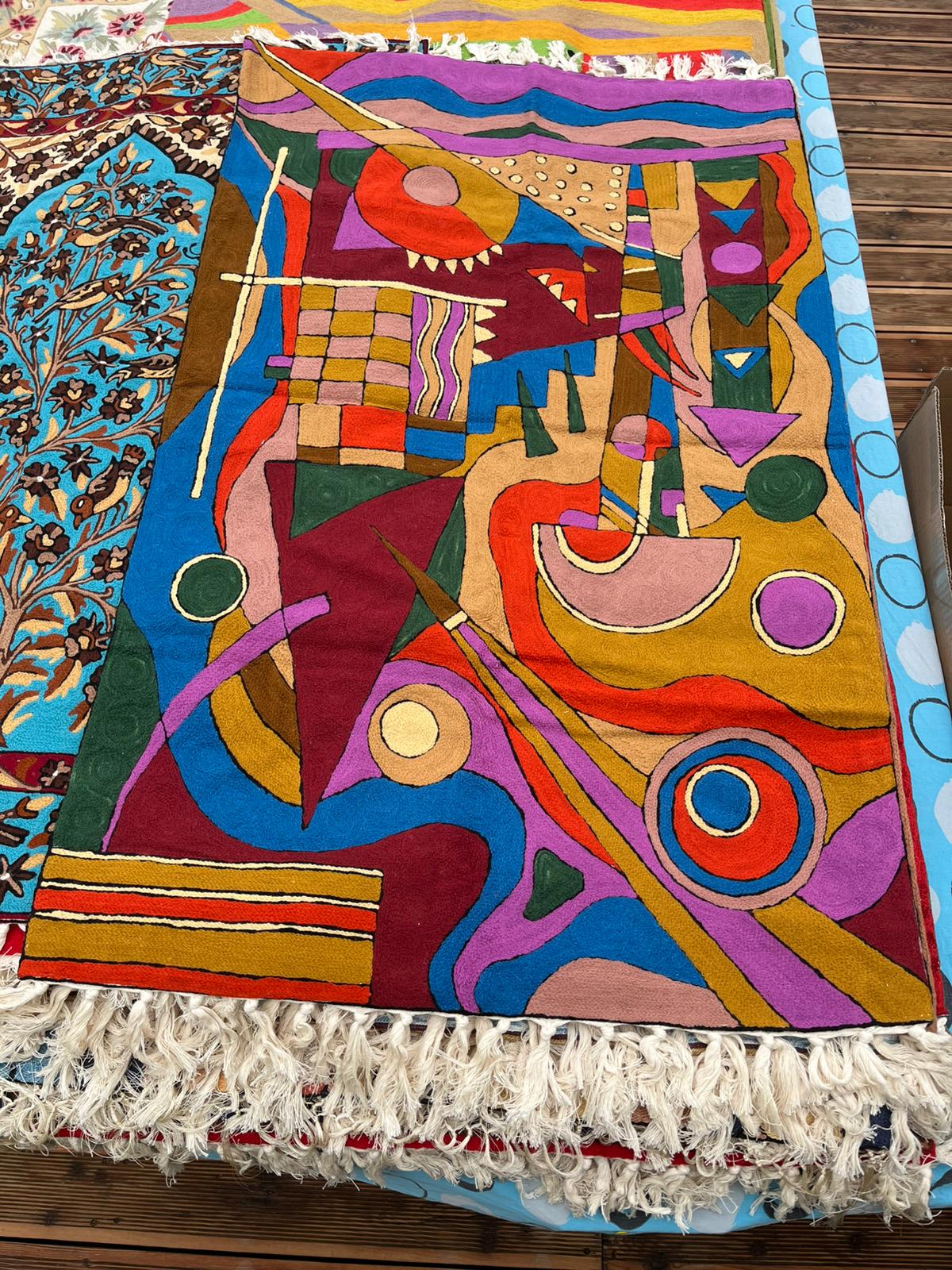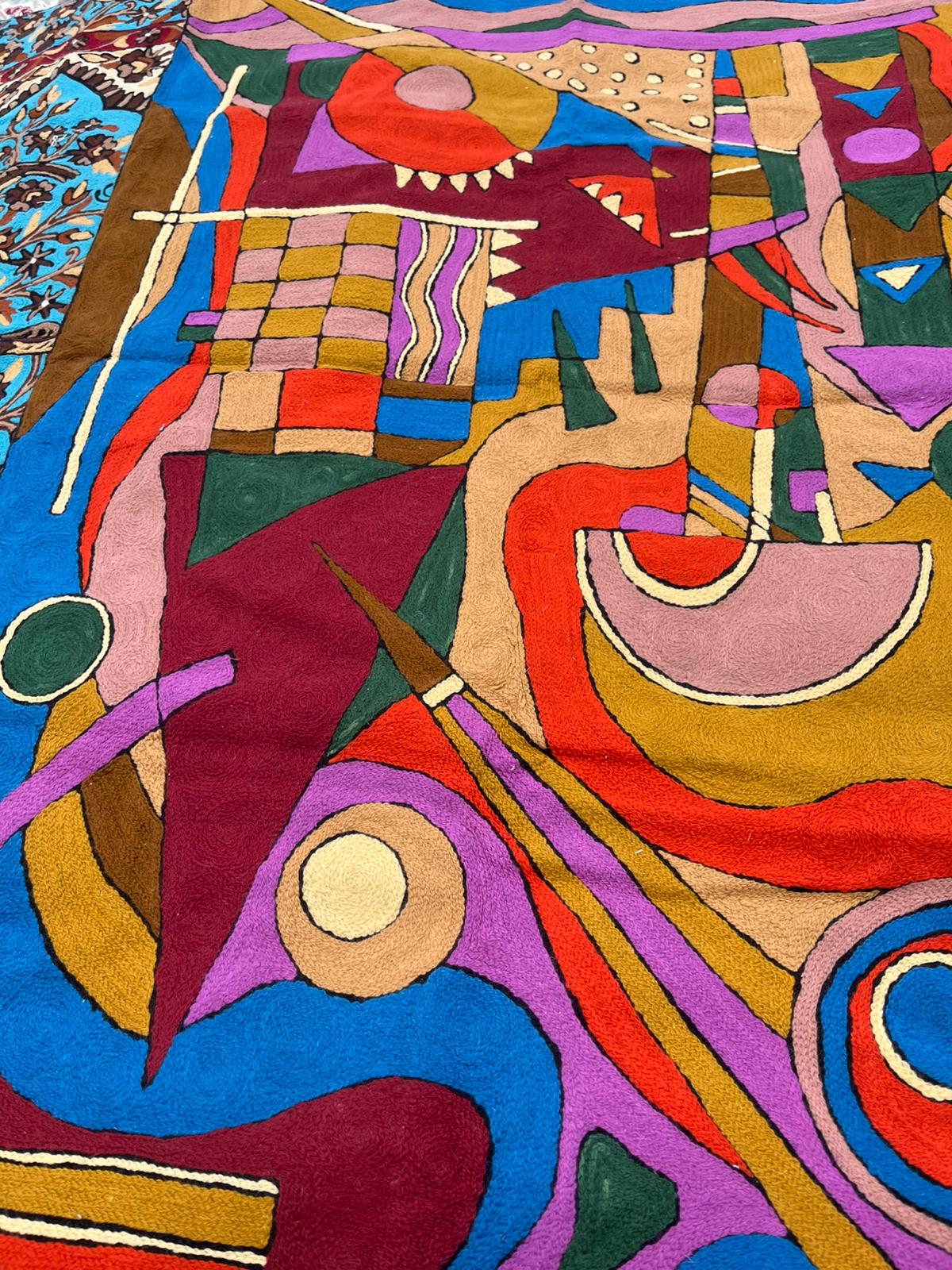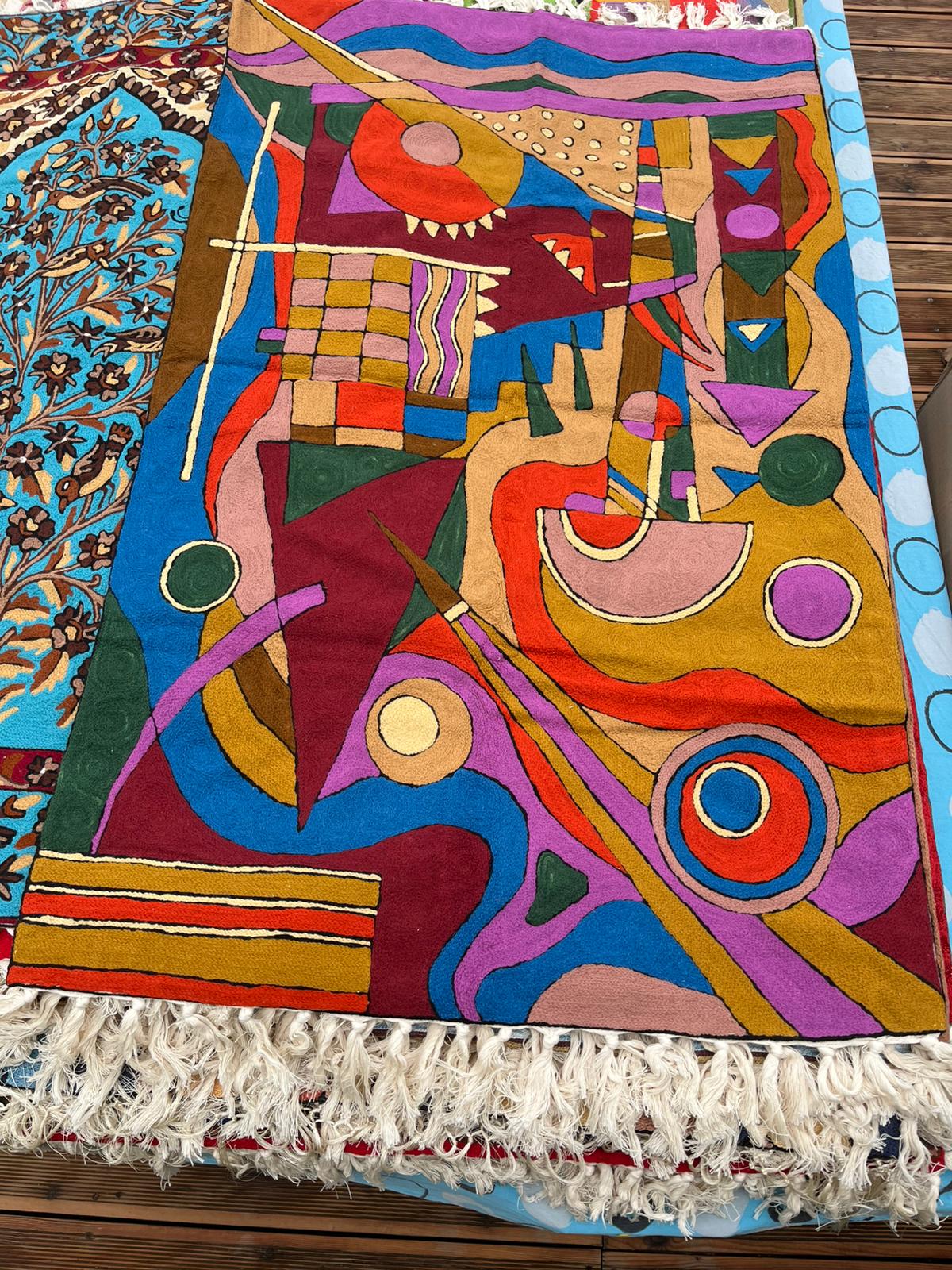 Wzór na przedstawionym dywanie kaszmirskim wydaje się być nowoczesną artystyczną interpretacją, przedstawia wielokolorową abstrakcję z geometrycznymi kształtami, które mogą nawet sugerować postacie lub obiekty. Kolorystyka dywanu jest bardzo bogata i intensywna, dominują w niej odcienie czerwieni i bordo, żółty i musztardowy, niebieski, zielony i pomarańczowy, a także różowy i fioletowy. Całość mocno energetyczna i ożywiająca.