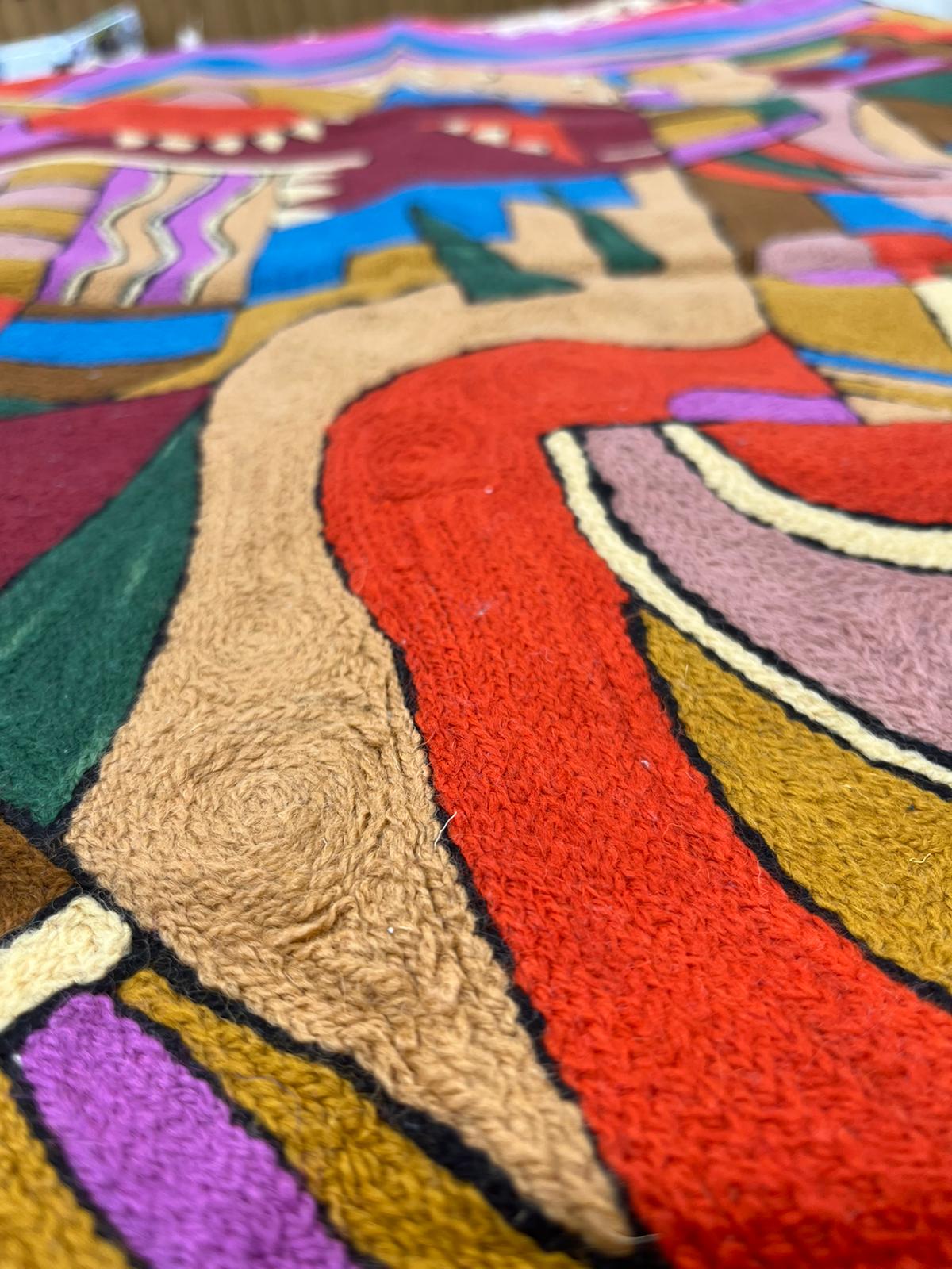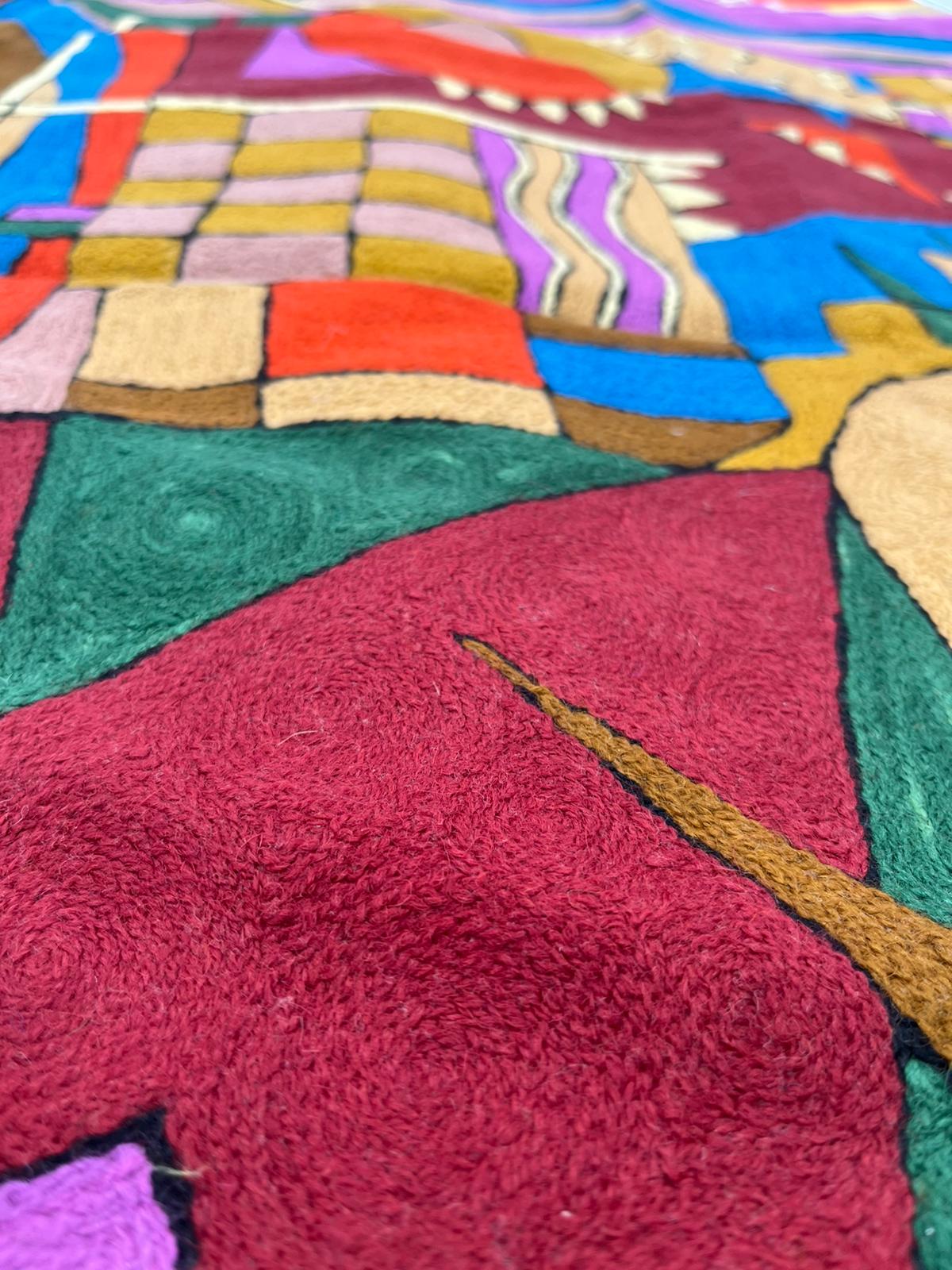 Dywan w całości ręcznie wykonany w Kashmirze, północne Indie, haftowany nicią wełnianą, technika haftu to ścieg łańcuszkowy.