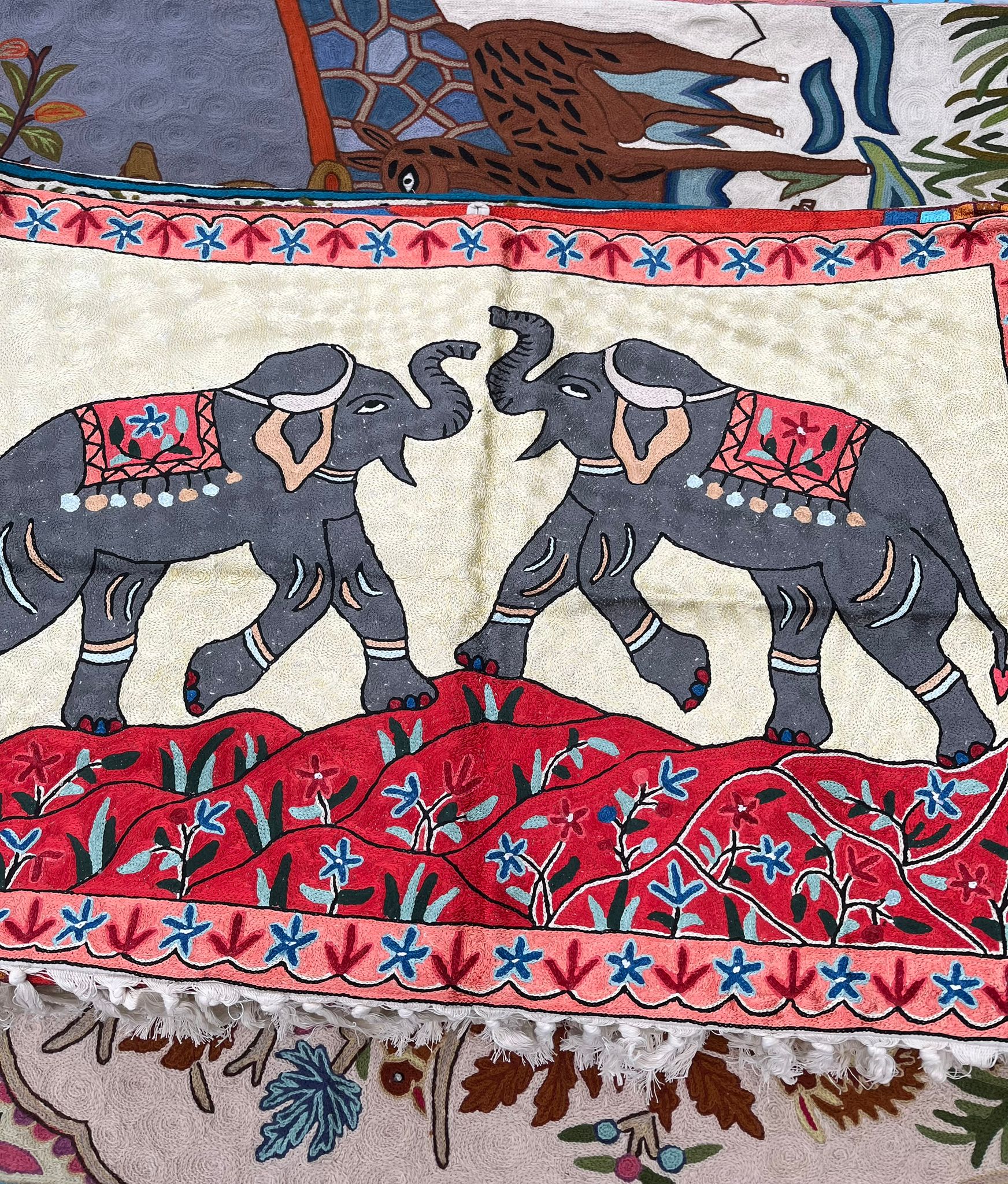 Prezentowany dywan kaszmirski przedstawiający dwa słonie, jest w całości ręcznie wykonany w Kashmirze, północne Indie, wyhaftowany nicią jedwabną/ SILK/, charakteryzuje się bogatą kolorystyką i szczegółowym wykonaniem, typowym dla haftu ręcznego typu łańcuszkowego. W kulturze indyjskiej i regionu Kaszmiru słonie często symbolizują siłę, mądrość, lojalność i szczęście, a nawet płodność. Często są przedstawiane w sztuce jako majestatyczne i ozdobione zwierzęta, co odzwierciedla ich wysoki status. Natomiast wzory roślinne i kwiatowe otaczające słonie są bardzo powszechne w sztuce orientalnej i zazwyczaj symbolizują raj, naturę, rozwój i harmonię. Połączenie tych motywów na dywanie kaszmirskim może sugerować, że ma on przynosić do domu pomyślność, siłę i piękno natury.