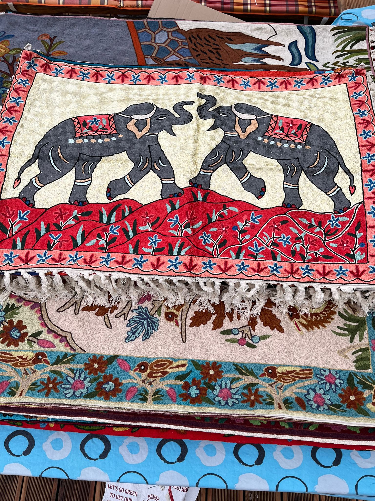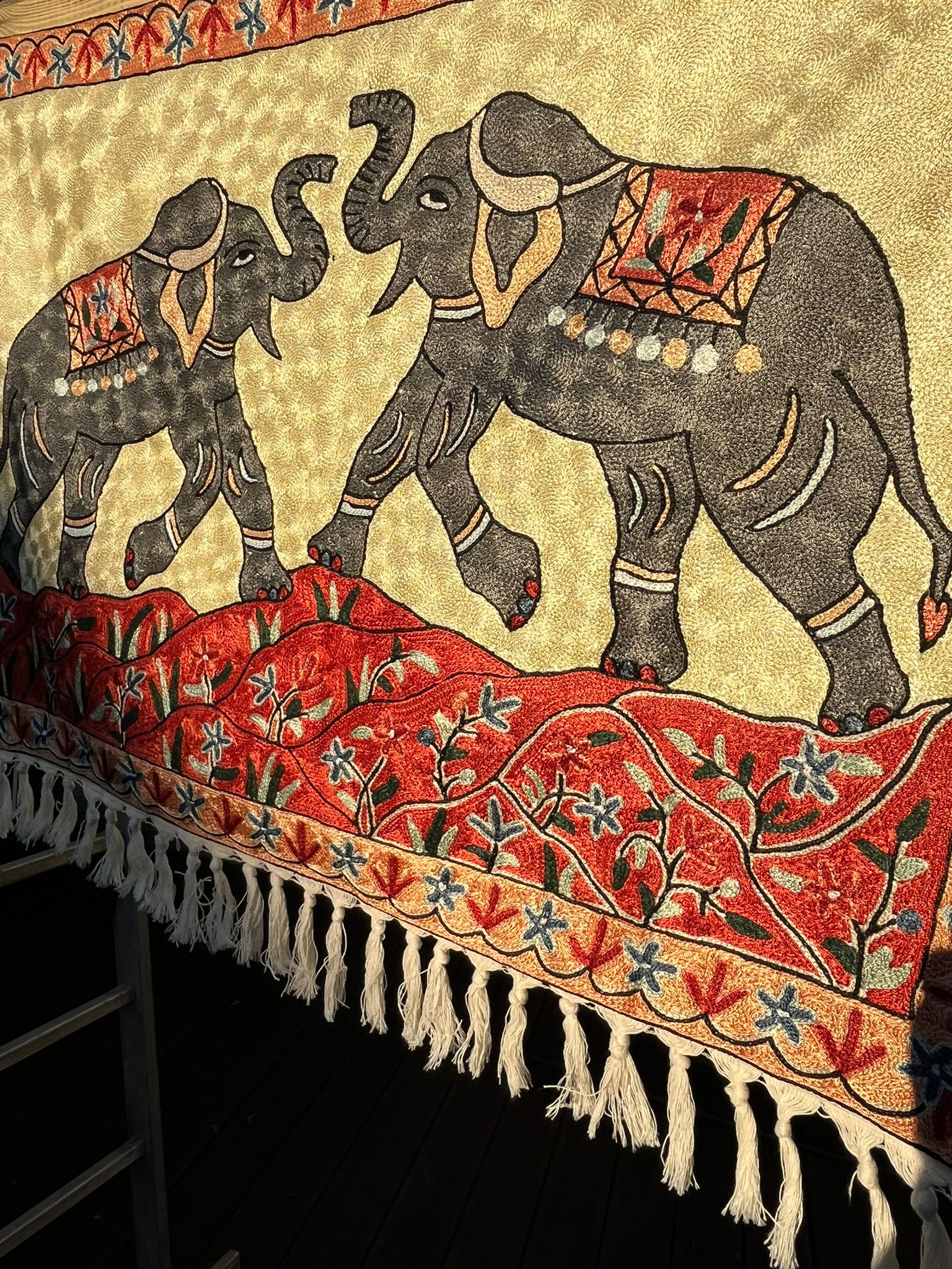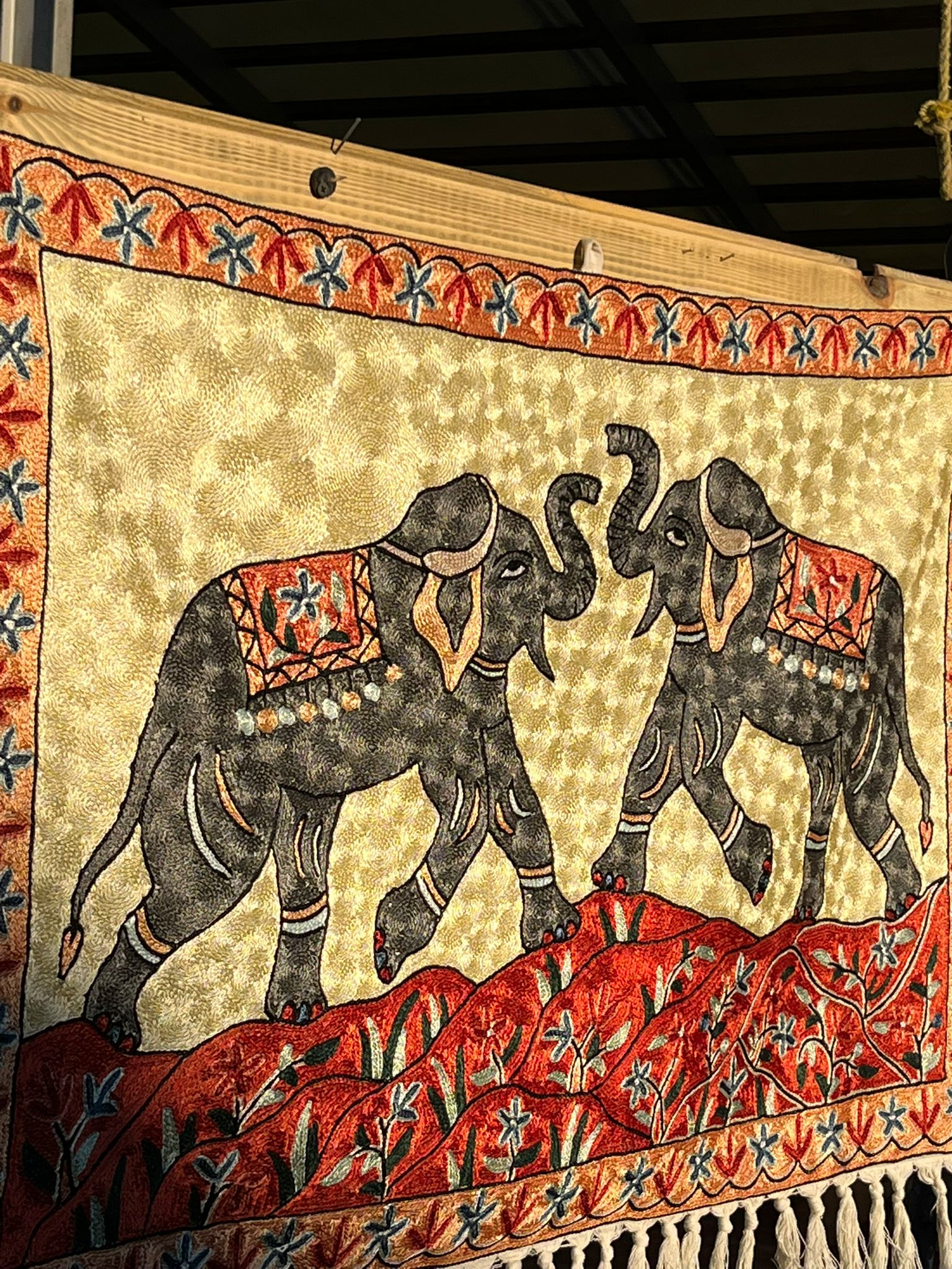 Na oferowanym dywanie kaszmirskim dominują ciepłe odcienie jasnożółte, złote i czerwone, jedynie słonie są wyhaftowane w kolorze szarym. Całość tworzy pozytywną, ciepłą kompozycję.