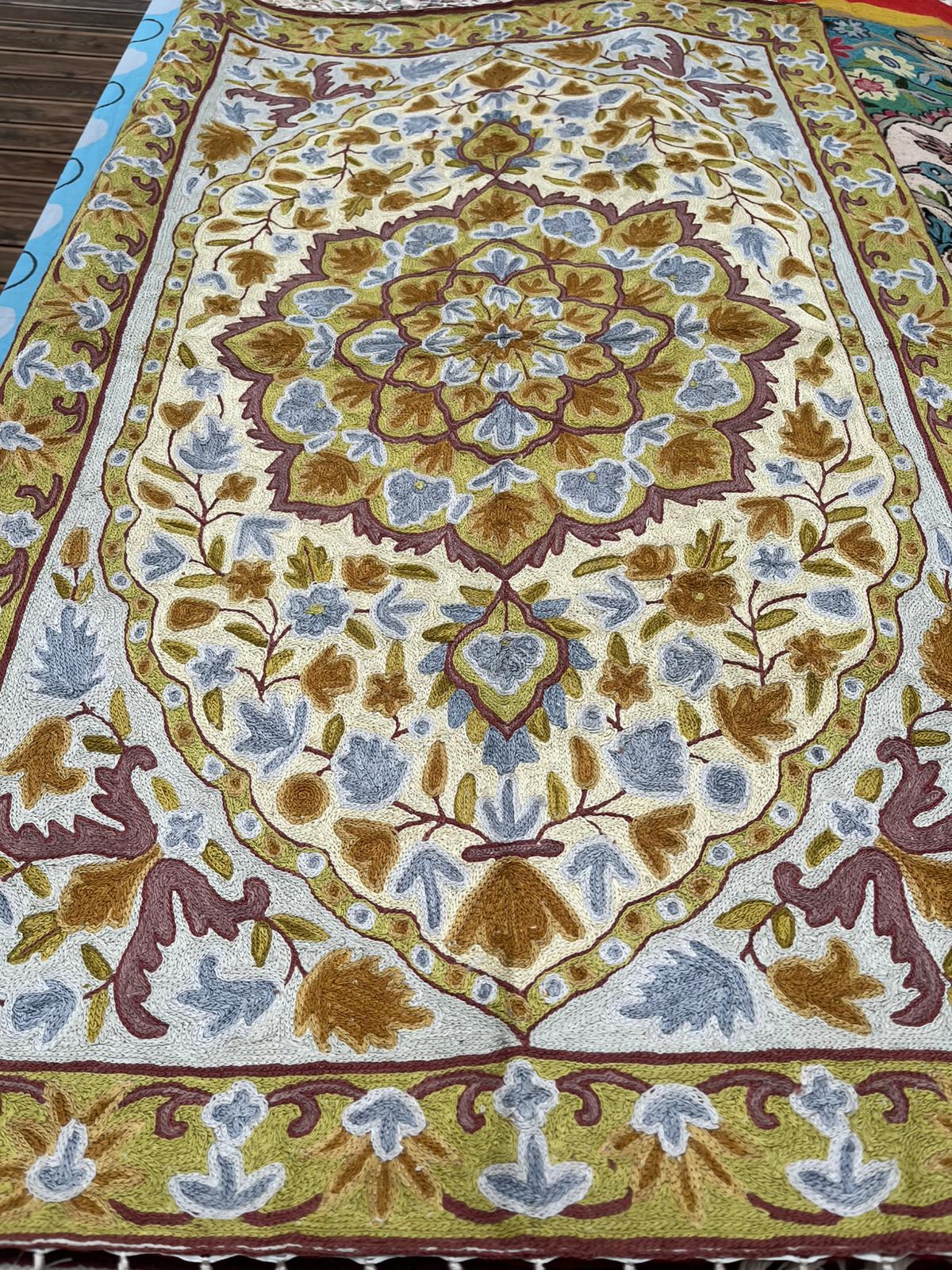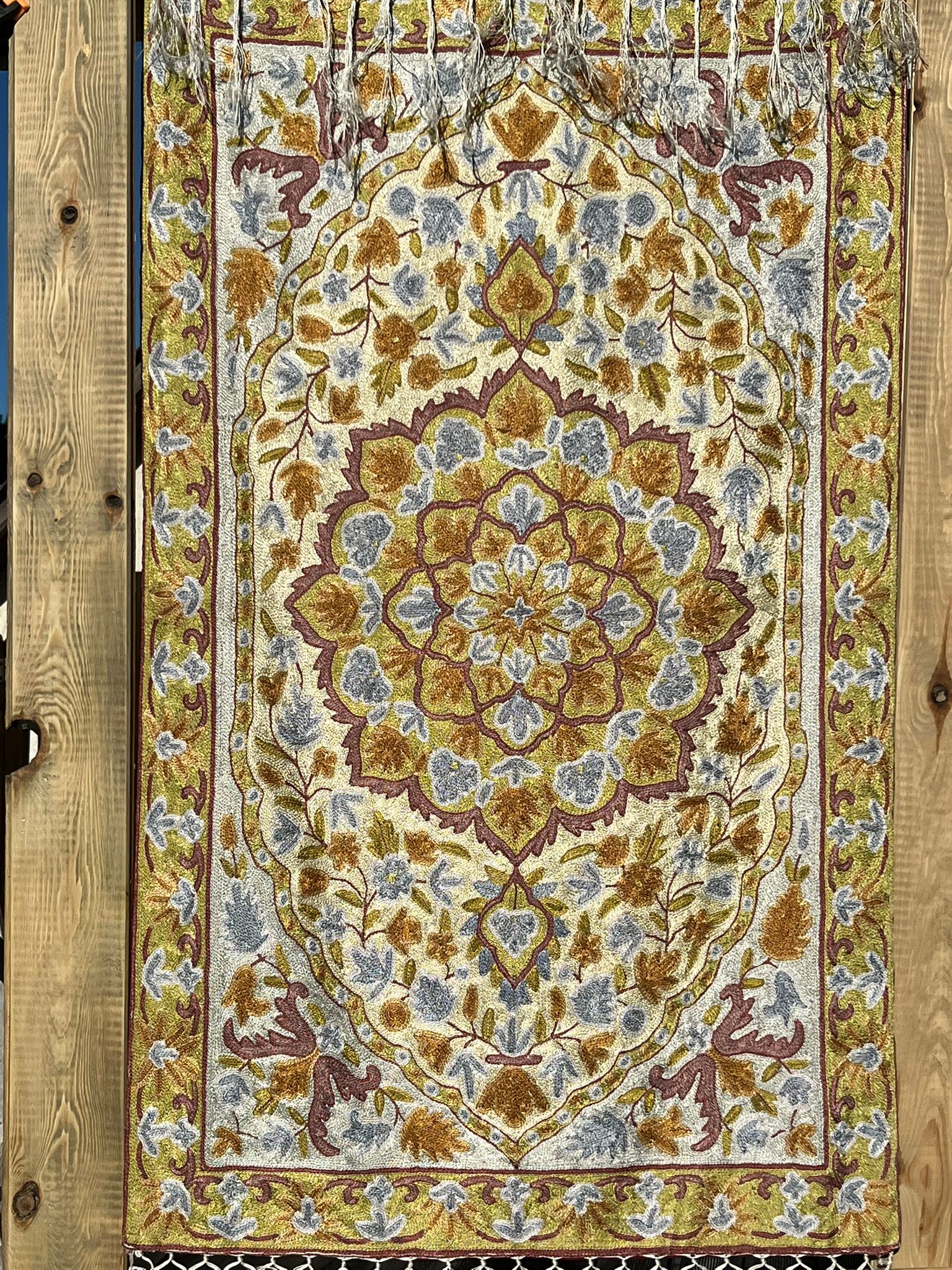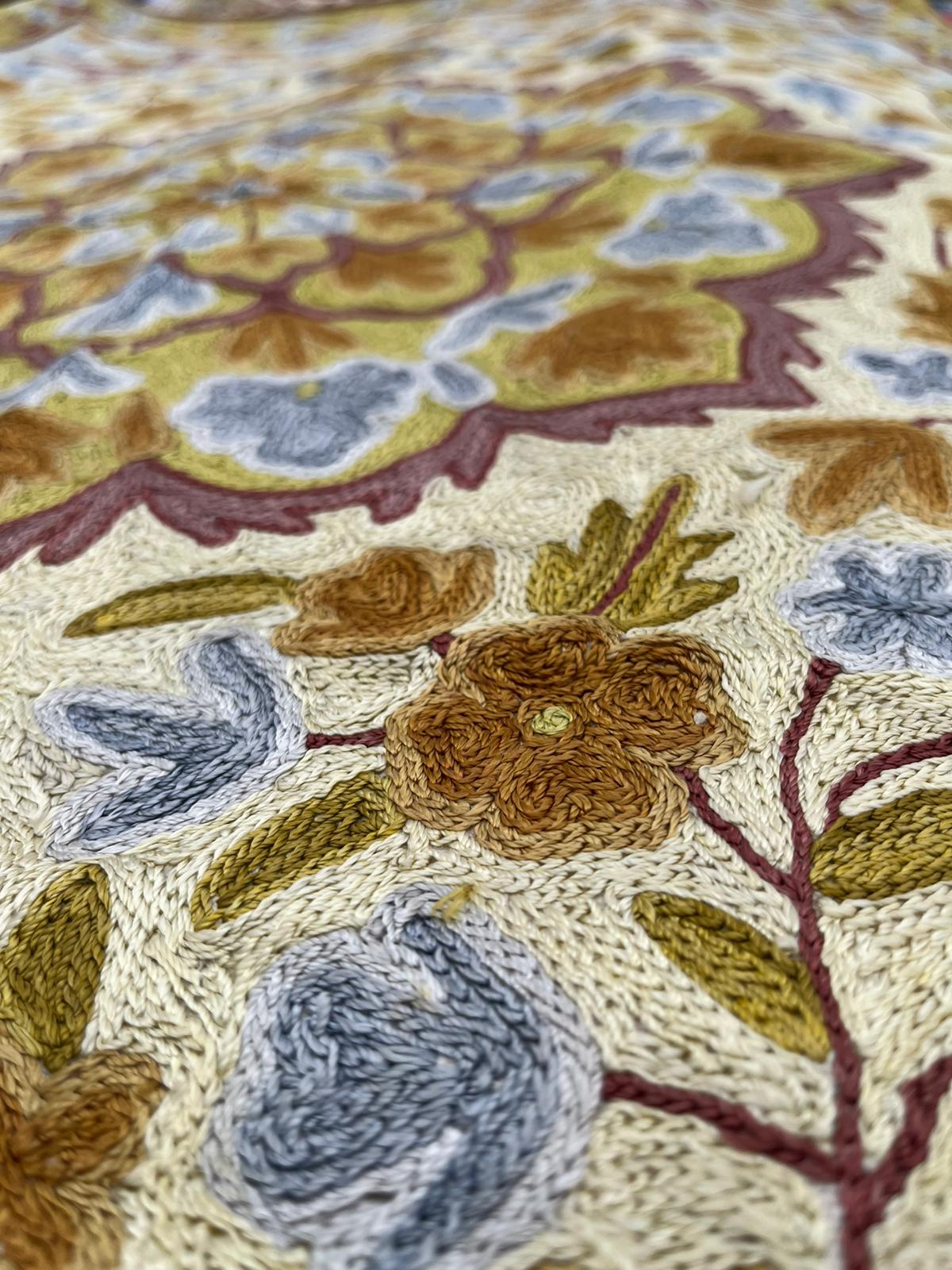 Dywan z haftem kaszmirskim przedstawiającym wzór w kształcie medalionu charakteryzuje się bogatą kolorystyką i szczegółowym wykonaniem, typowym dla haftu ręcznego typu łańcuszkowego.
