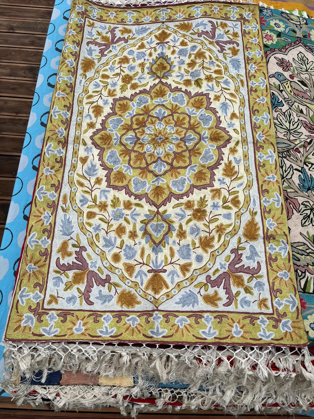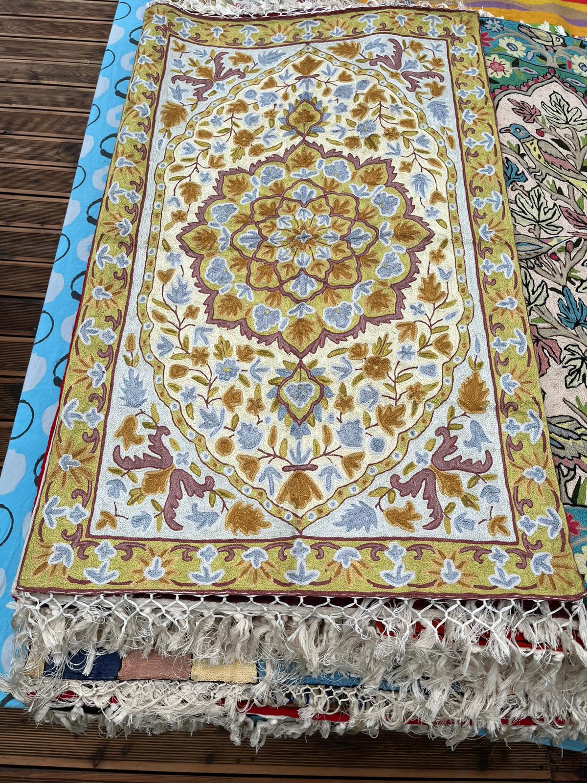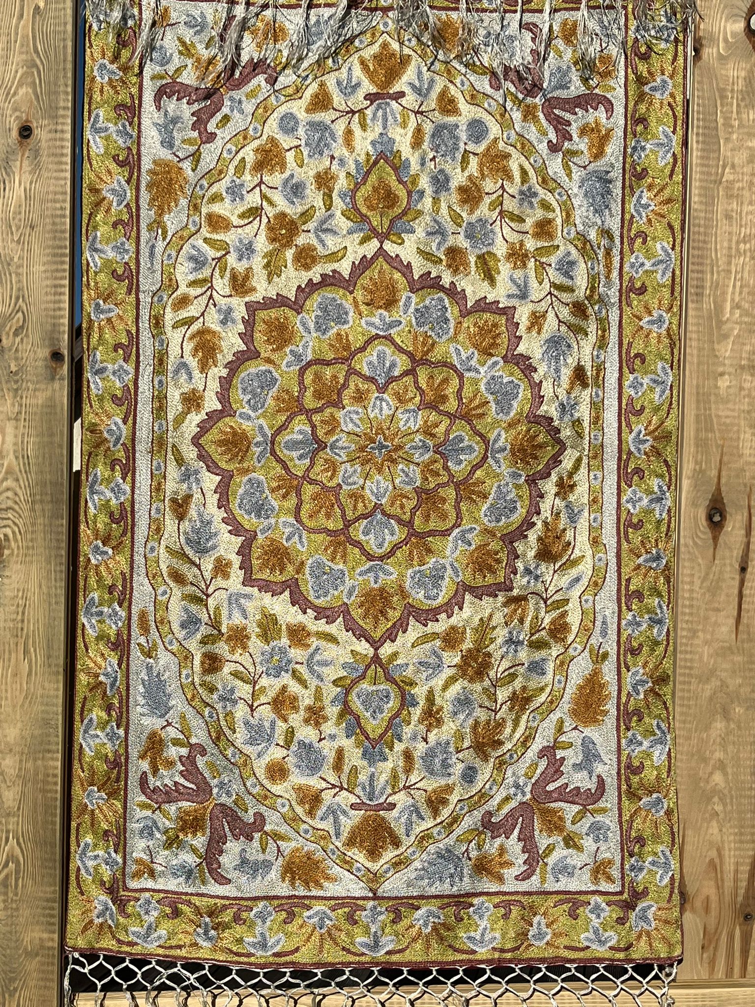 Dywan z haftem kaszmirskim przedstawiającym wzór w kształcie medalionu charakteryzuje się bogatą kolorystyką i szczegółowym wykonaniem, typowym dla haftu ręcznego typu łańcuszkowego.
