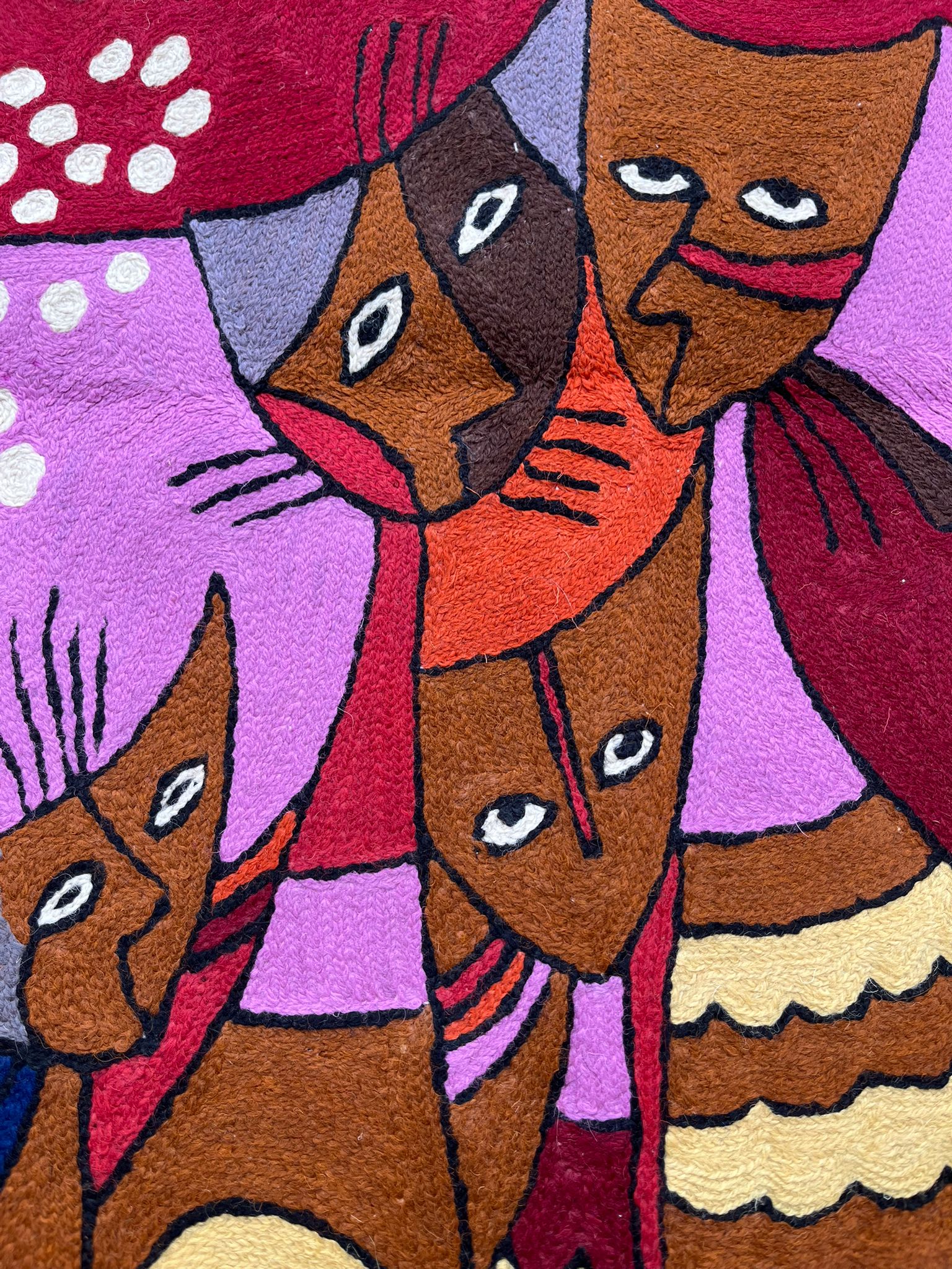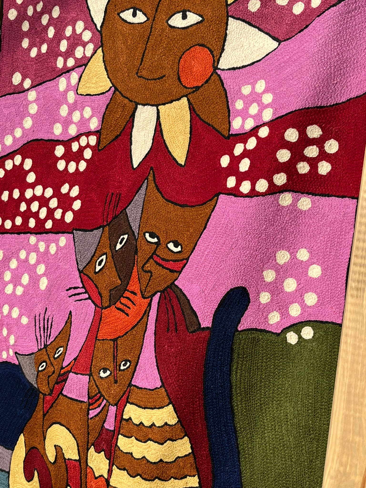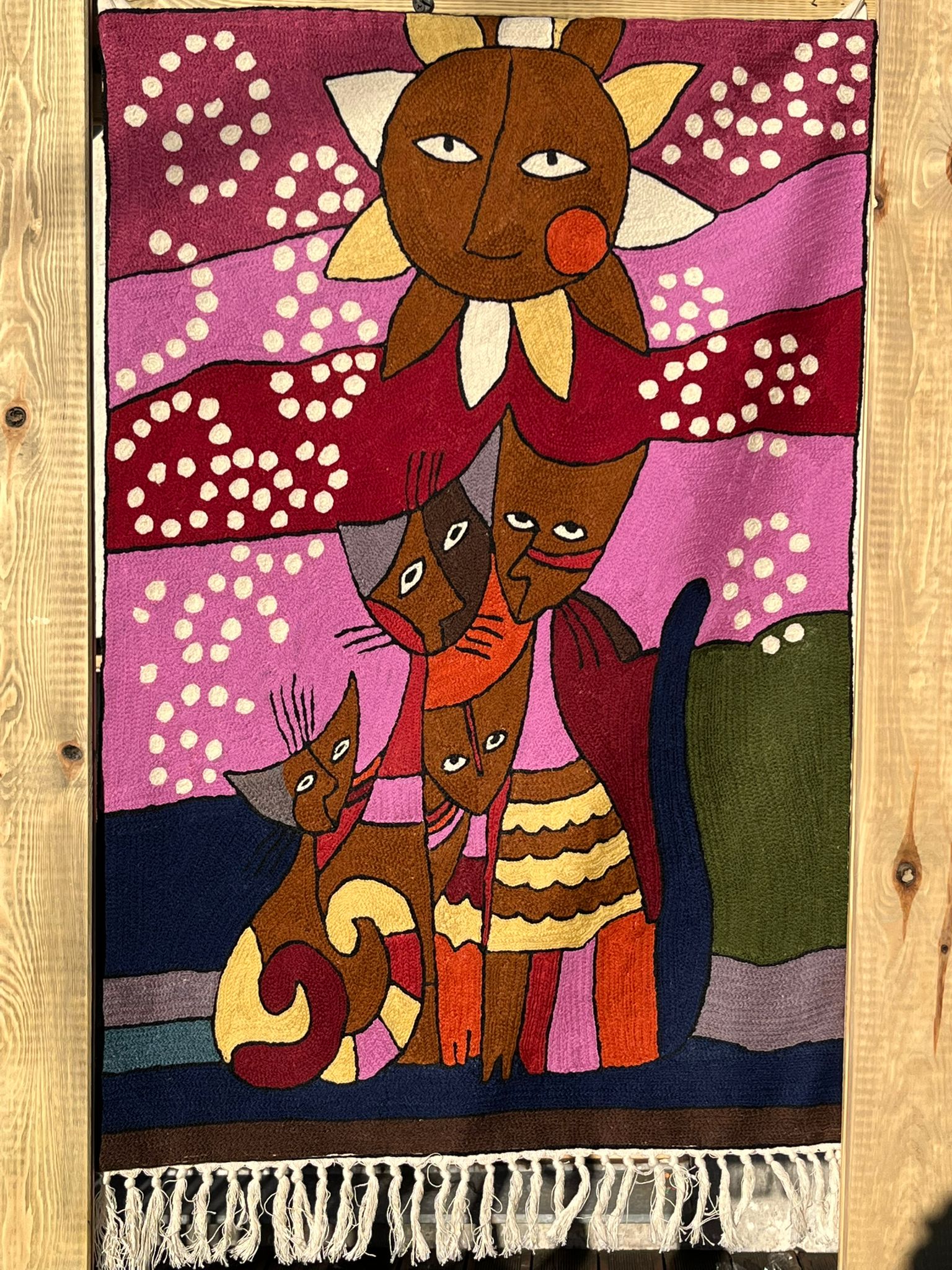 Całość obrazu na prezentowanym dywanie kaszmirskim jest utrzymana w żywej bogatej kolorystyce bardzo charakterystycznej dla Indii. Tematyka dywanu to motyw słońca z ludzką twarzą cechującego się wyrazistymi kolorami i promieniami w kształcie spiral oraz znajdującymi się poniżej słońca czterema kotami również przedstawionymi w uproszczony, artystyczny sposób, z geometrycznymi kształtami i wzorami. Tło dywanu wypełniają spiralne wzory.