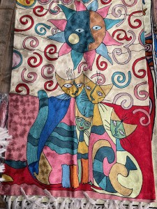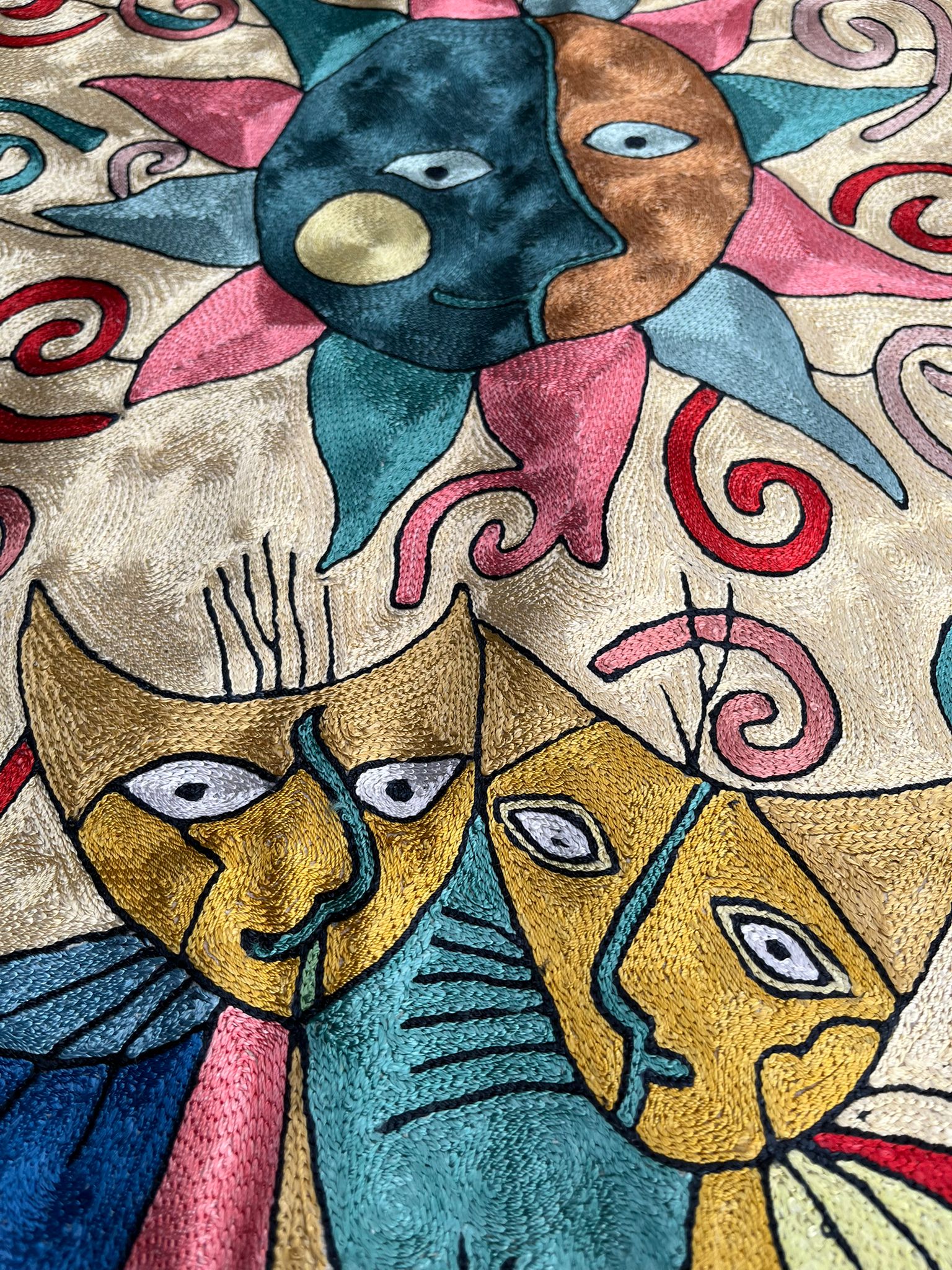 Całość obrazu na prezentowanym dywanie kaszmirskim jest utrzymana w żywej bogatej kolorystyce bardzo charakterystycznej dla Indii. Tematyka dywanu to motyw słońca z ludzką twarzą cechującego się wyrazistymi kolorami i promieniami w kształcie spiral oraz znajdującymi się poniżej słońca czterema kotami również przedstawionymi w uproszczony, artystyczny sposób, z geometrycznymi kształtami i wzorami. Tło dywanu wypełniają spiralne wzory.