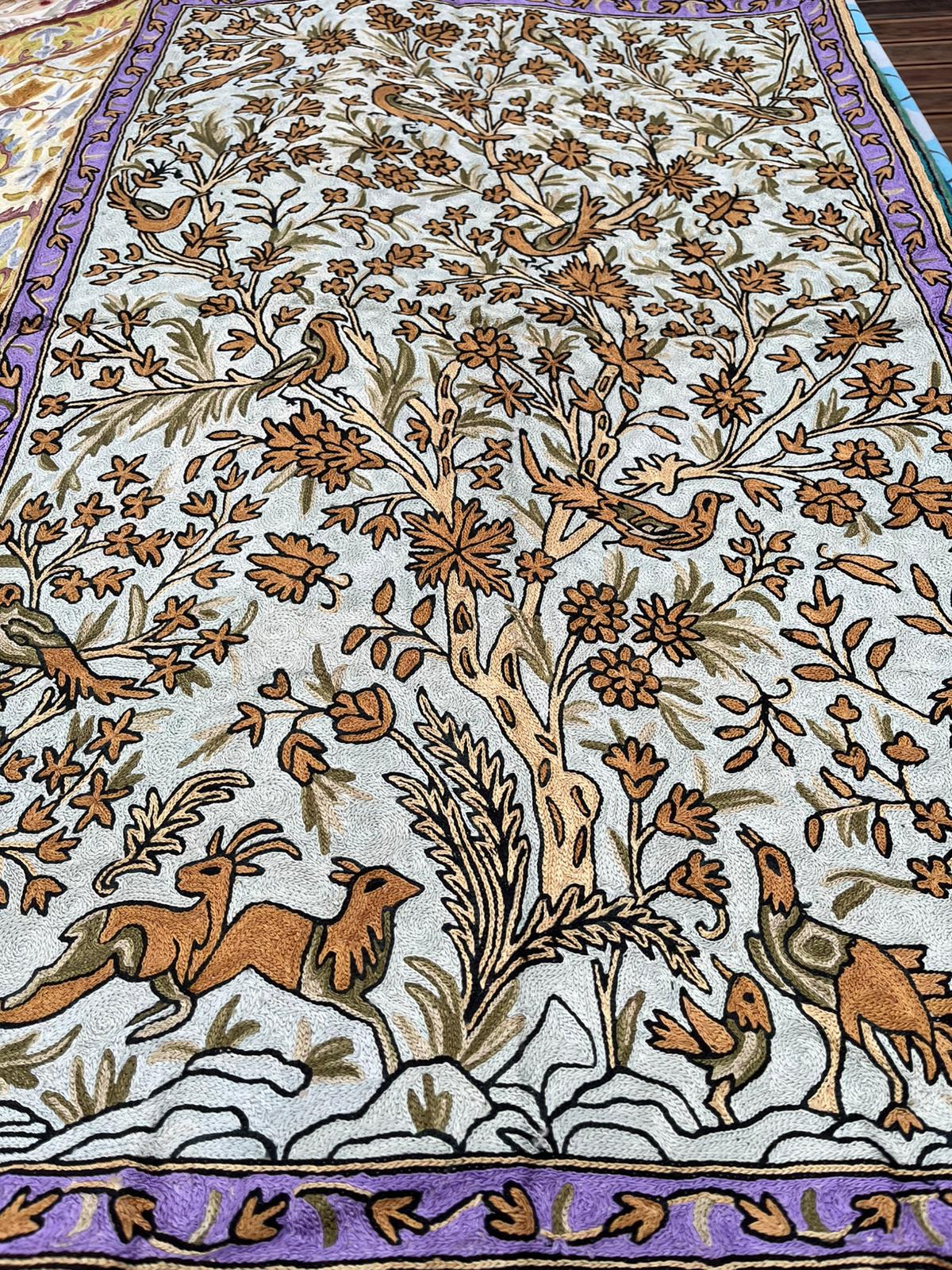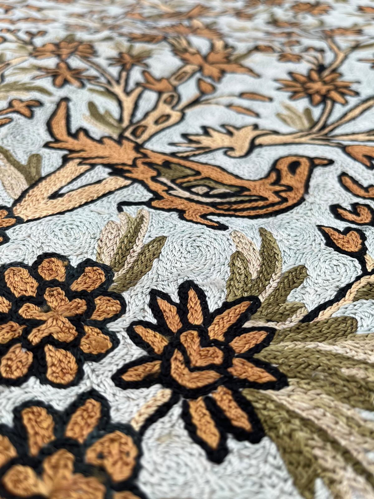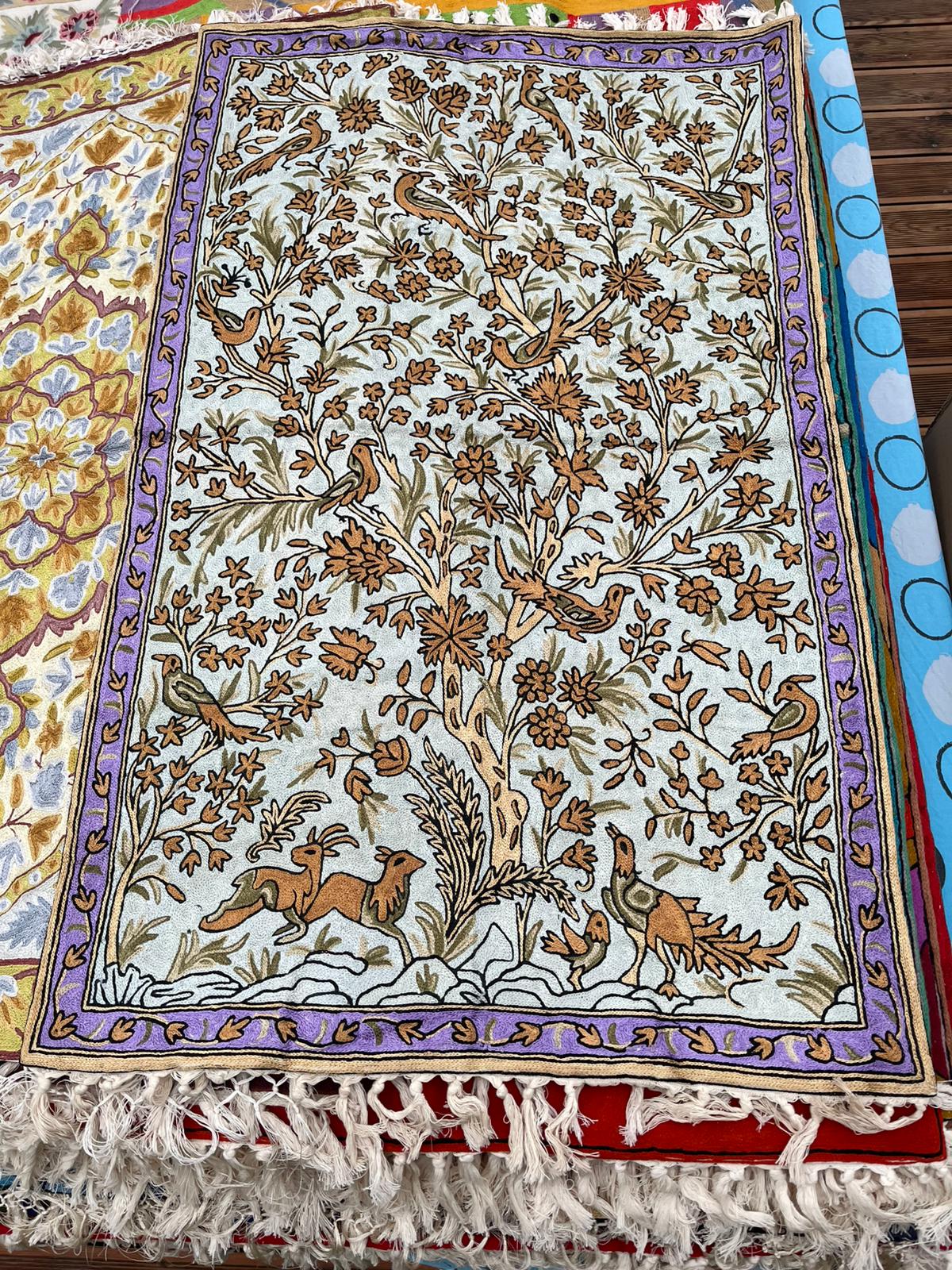 Dywan z haftem kaszmirskim z głównym motywem roślinnym przedstawiającym drzewo życia (Tree of Life), charakteryzuje się bogatą kolorystyką i szczegółowym wykonaniem, typowym dla haftu ręcznego typu łańcuszkowego.