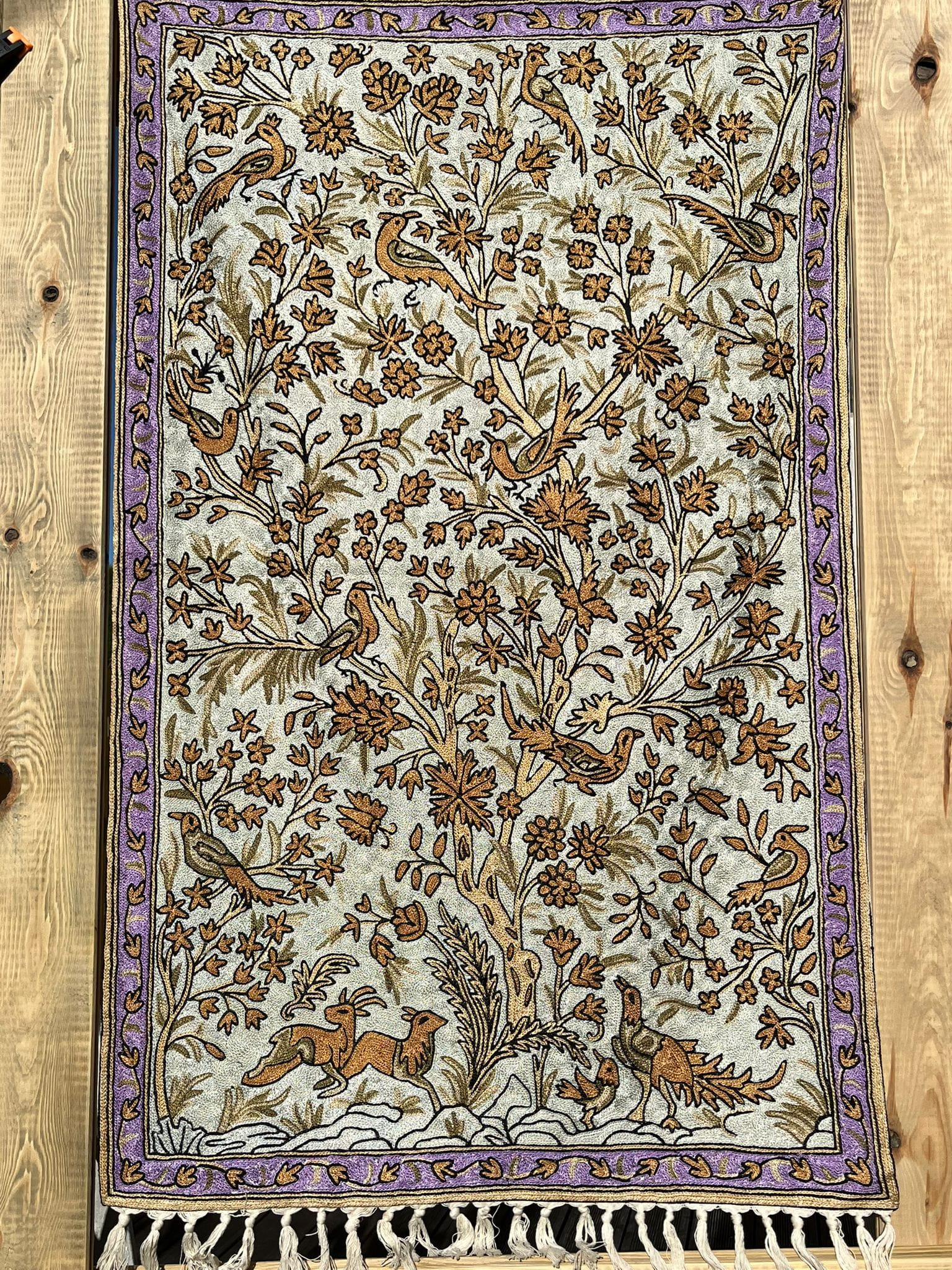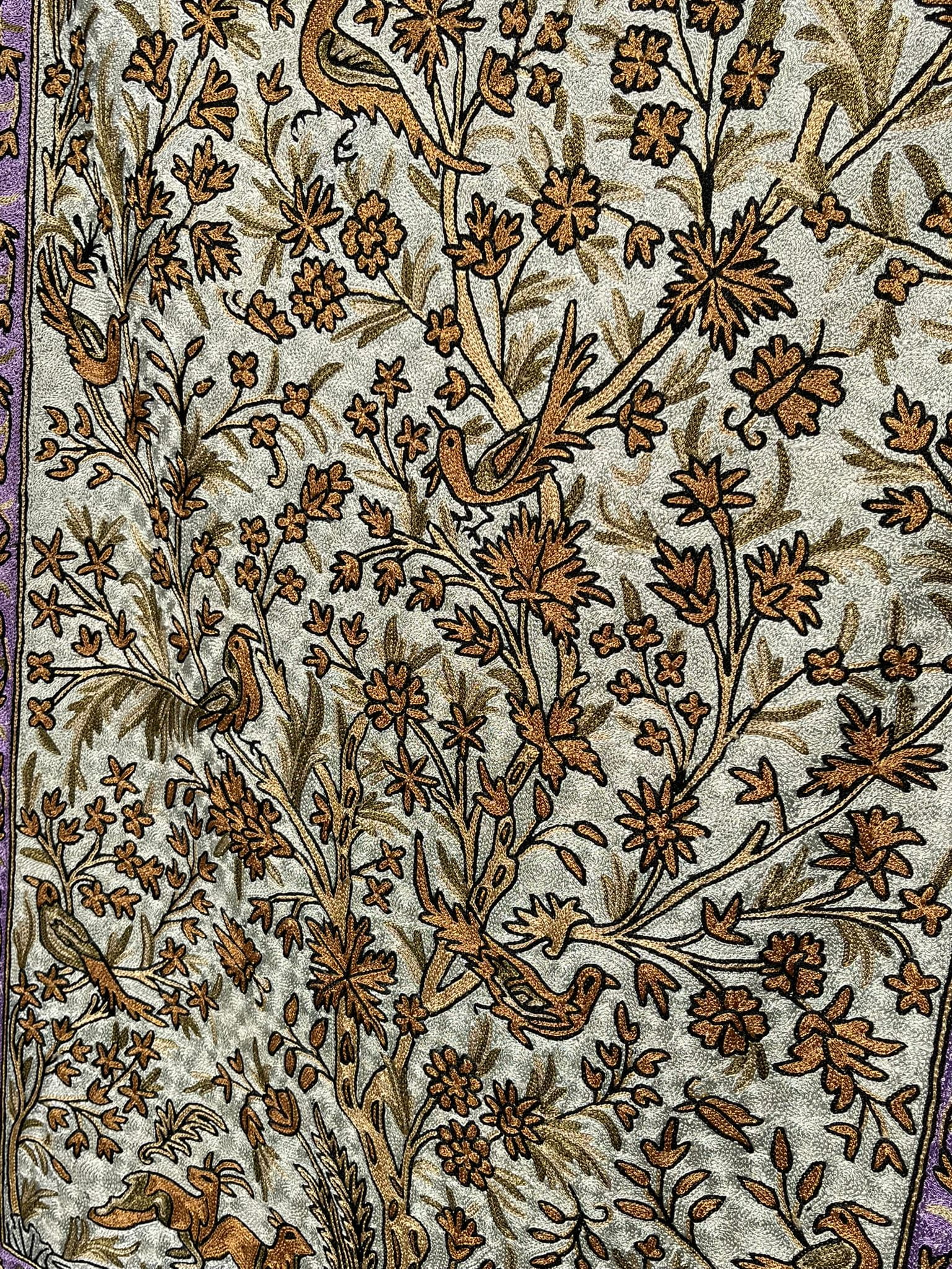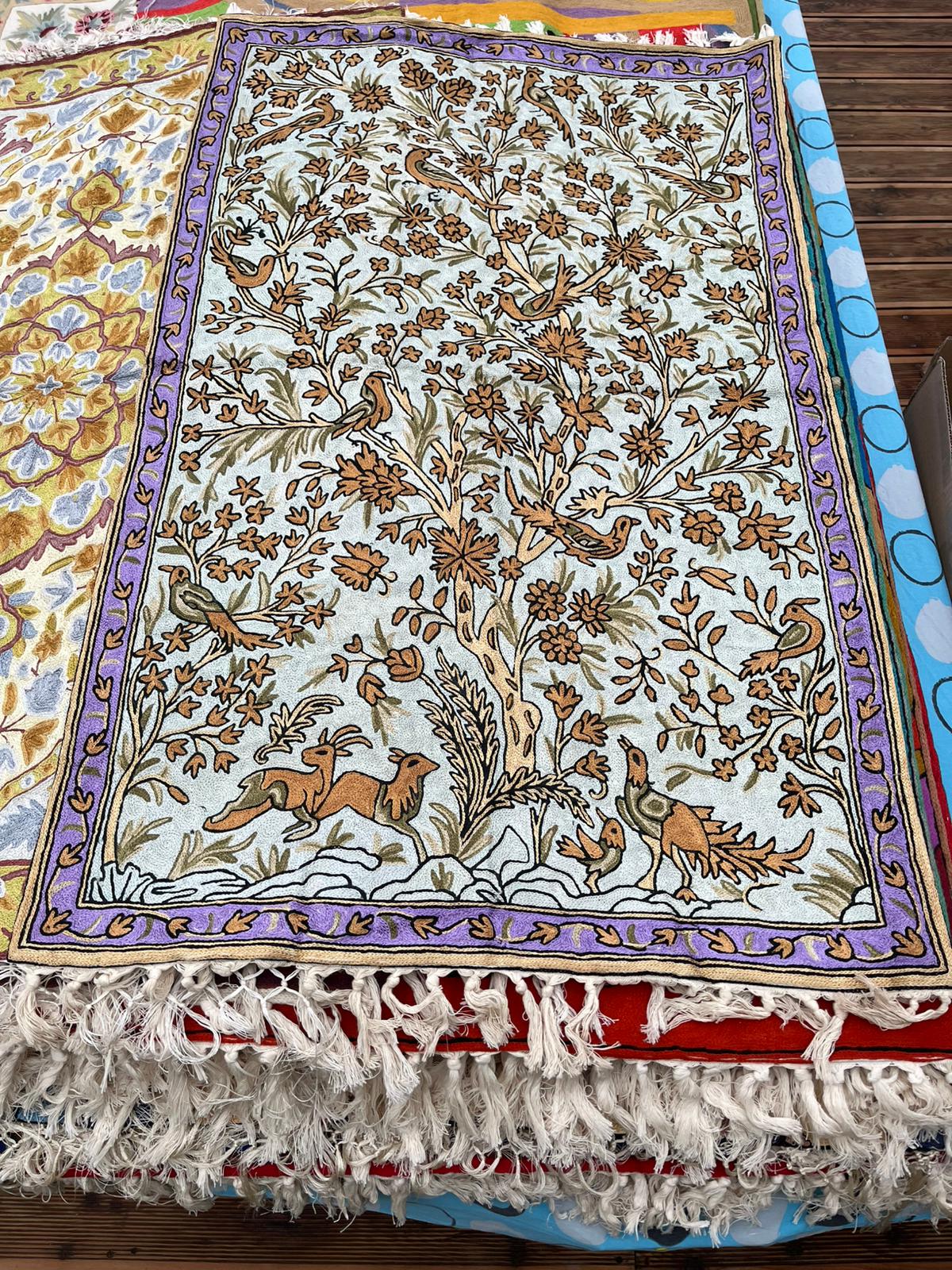Dywan z haftem kaszmirskim z głównym motywem roślinnym przedstawiającym drzewo życia (Tree of Life), charakteryzuje się bogatą kolorystyką i szczegółowym wykonaniem, typowym dla haftu ręcznego typu łańcuszkowego.