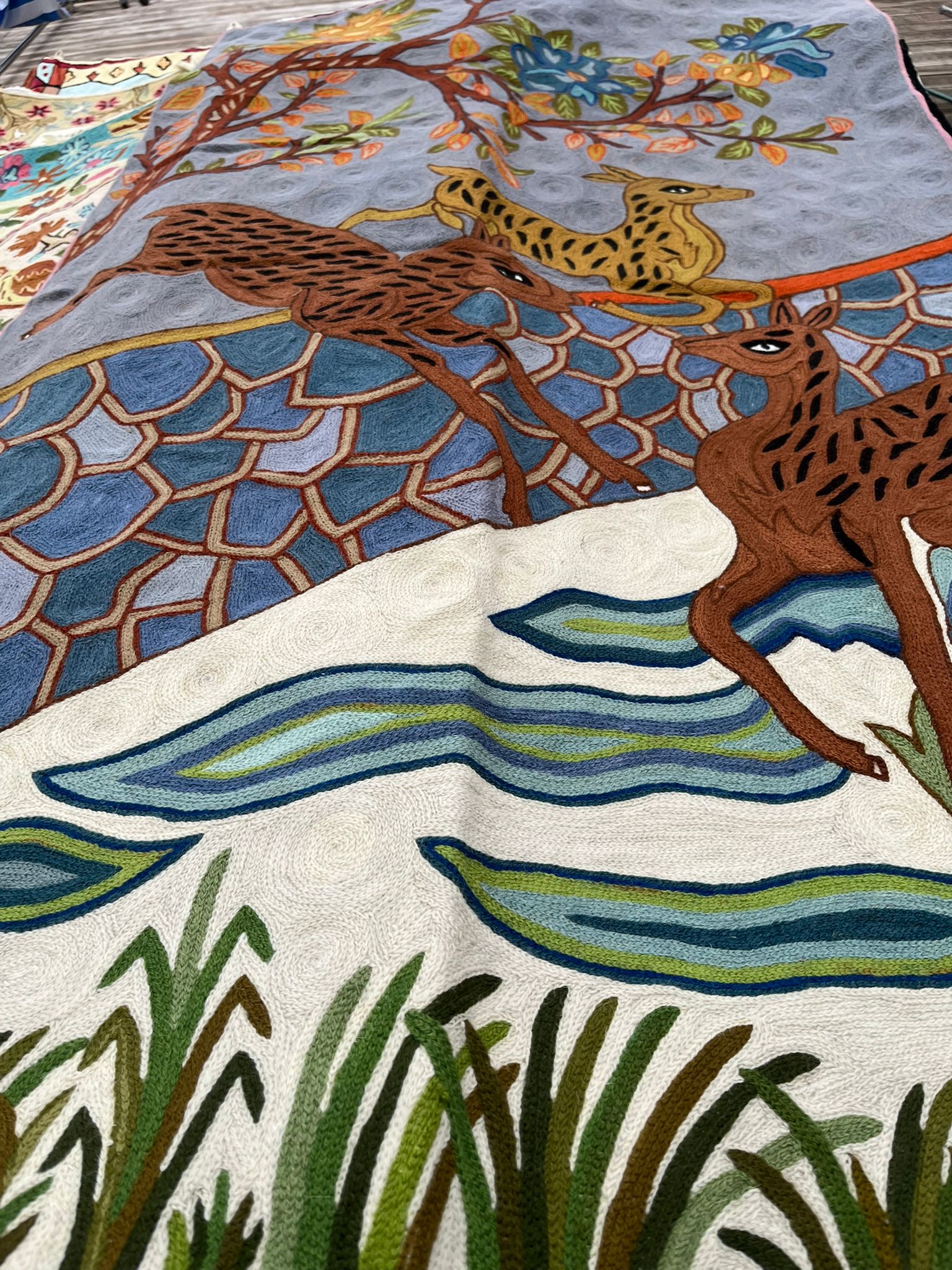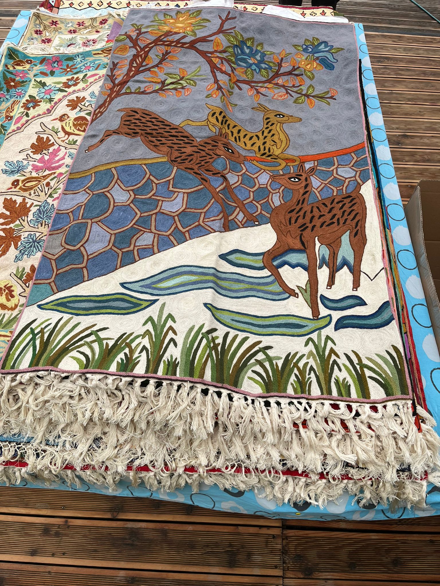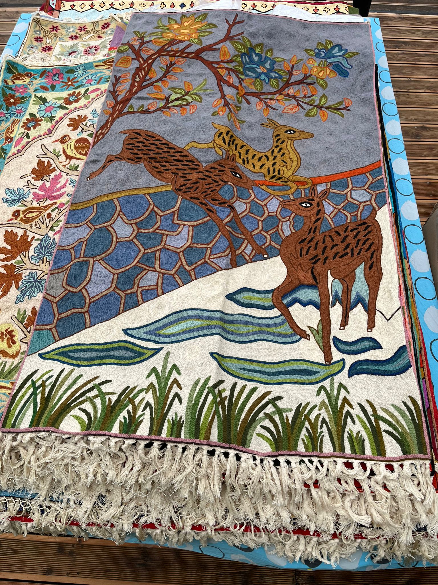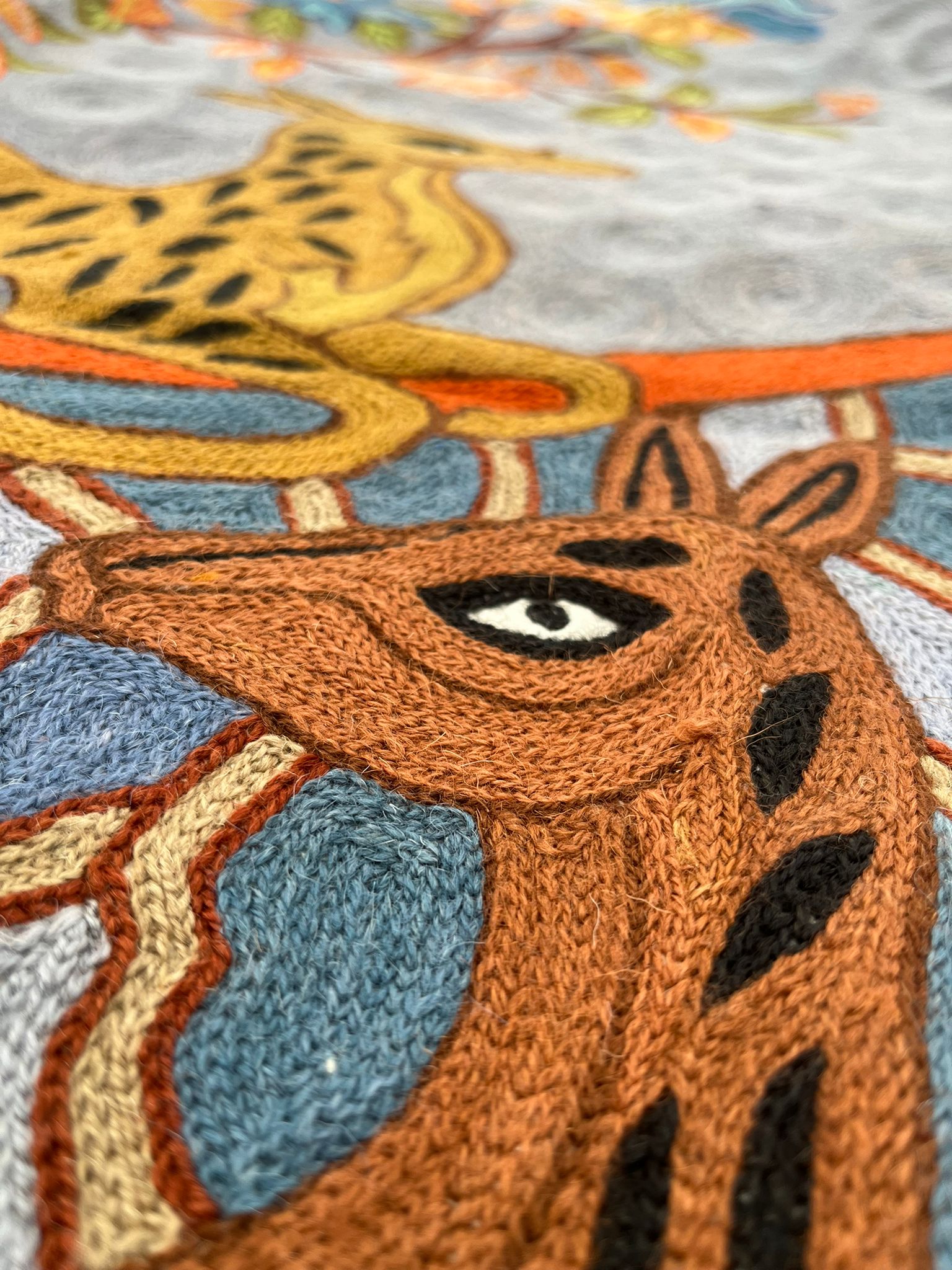 Dywan z haftem kaszmirskim z głównym motywem zwierzęcym przedstawiającym scenę z naturą, charakteryzuje się bogatą kolorystyką i szczegółowym wykonaniem, typowym dla haftu ręcznego typu łańcuszkowego.