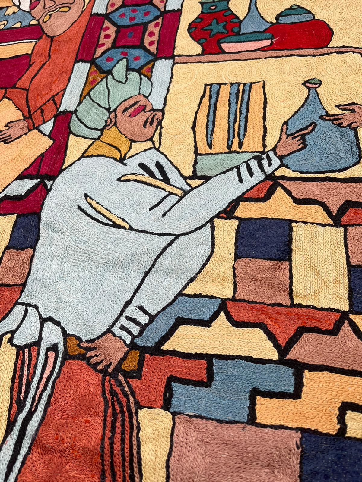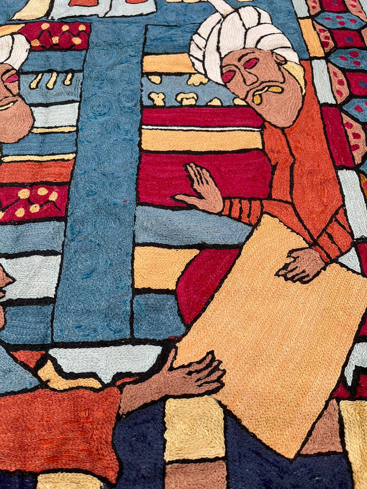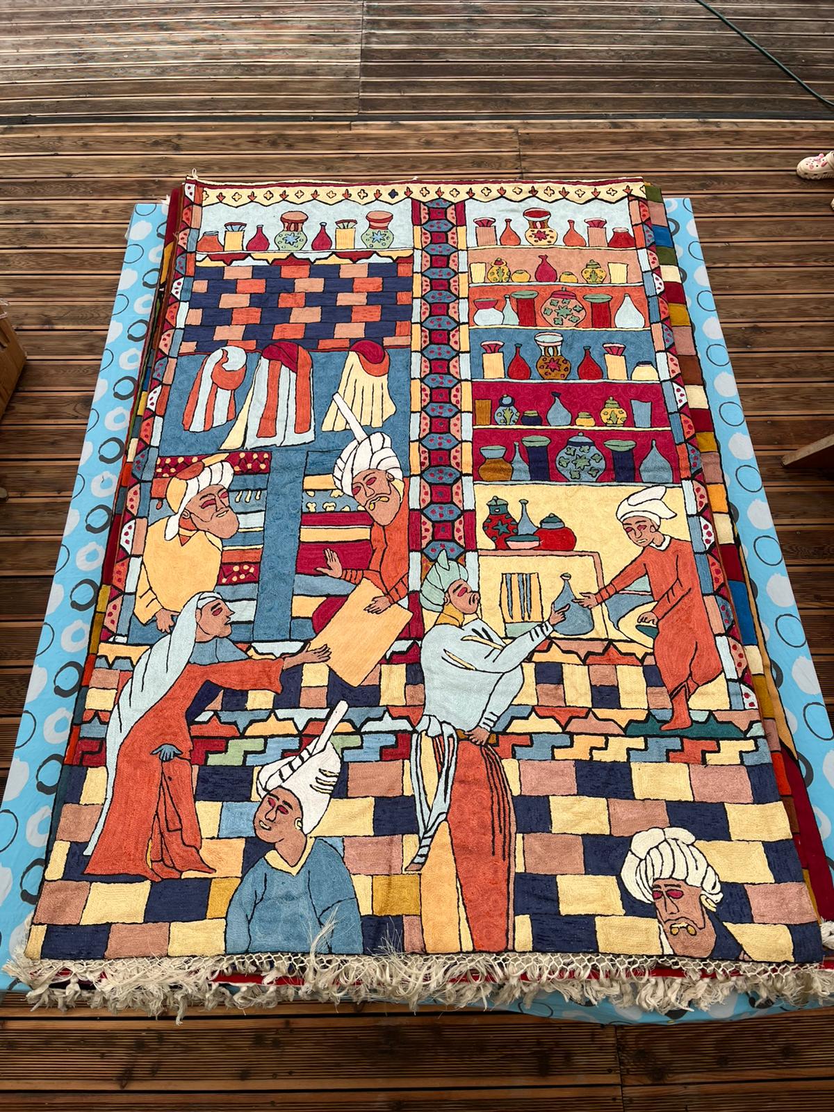 Oferowany przez nas dywan kaszmirski w całości ręcznie haftowany nicią jedwabną/ silk/ przedstawia scenę z życia ludzi, najprawdopodobniej na targu lub w sklepie. Widać na nim klika postaci w tradycyjnych strojach, zajętych czynnościami takimi , jak sprzedaż, kupowanie czy rozmowa. W tle znajdują się półki z naczyniami i innymi przedmiotami, co jak żywo sugeruje odbywający się handel. Dywan charakteryzuje się bogatą i żywą paletą barw. Dominują odcienie czerwieni, niebieskiego, żółtego i brązu. Twórcy użyli tutaj silnych kontrastów, na przykład między niebieskimi i czerwonymi elementami wzoru, a także między jasnymi postaciami a ciemniejszymi fragmentami tła. Kolory są wykorzystane do tworzenia wzorów geometrycznych, takich jak szachownica na podłodze oraz do detali postaci i przedmiotów takich, jak naczynia na półkach. Cała kolorystyka nadaje dywanowi ciepły i dynamiczny charakter, odzwierciedlając przy tym tętniącą życiem scenę.