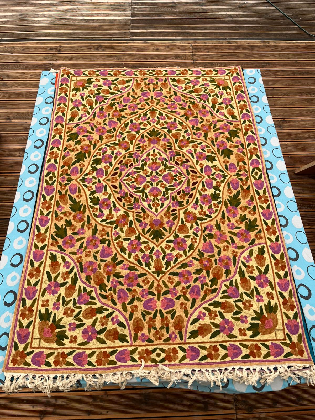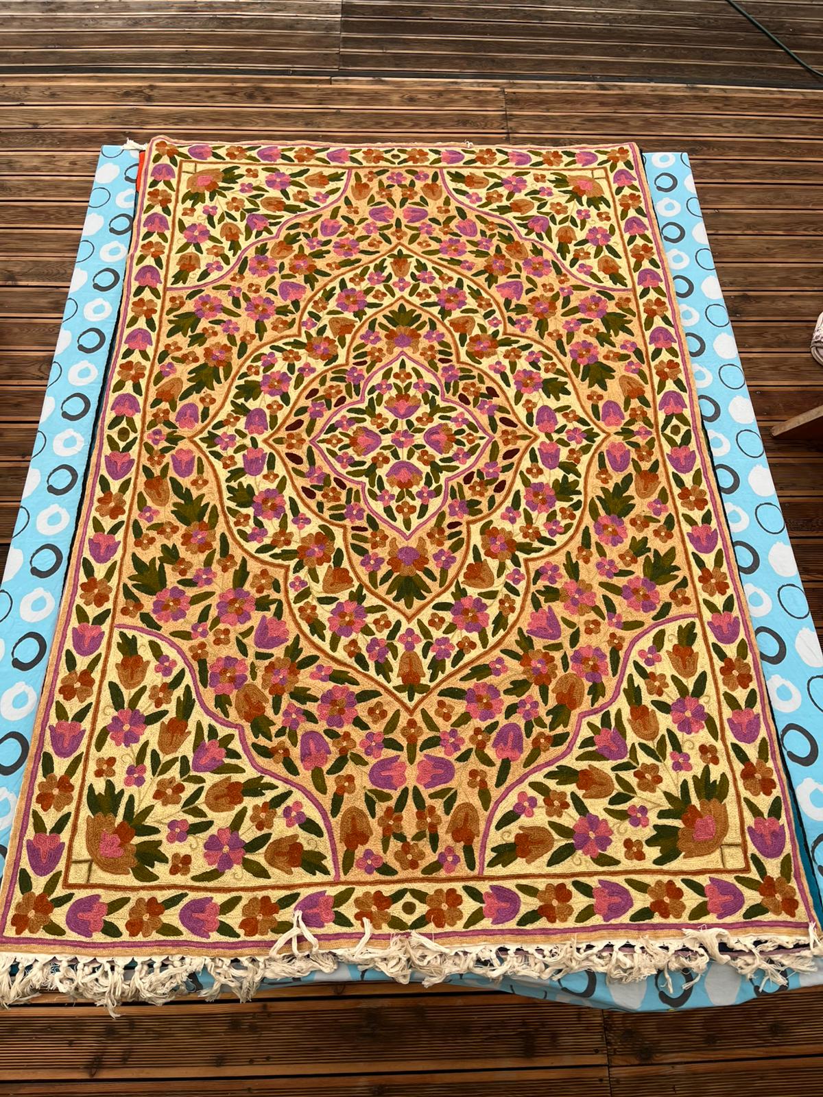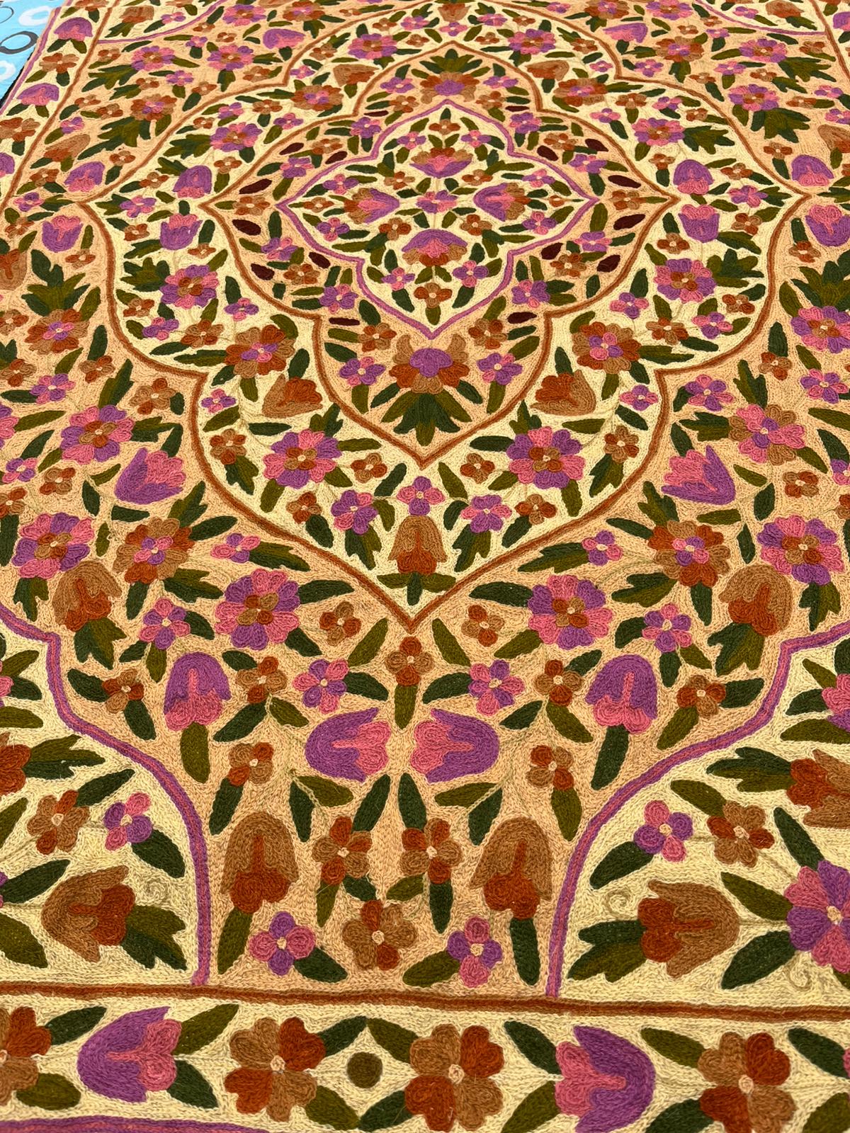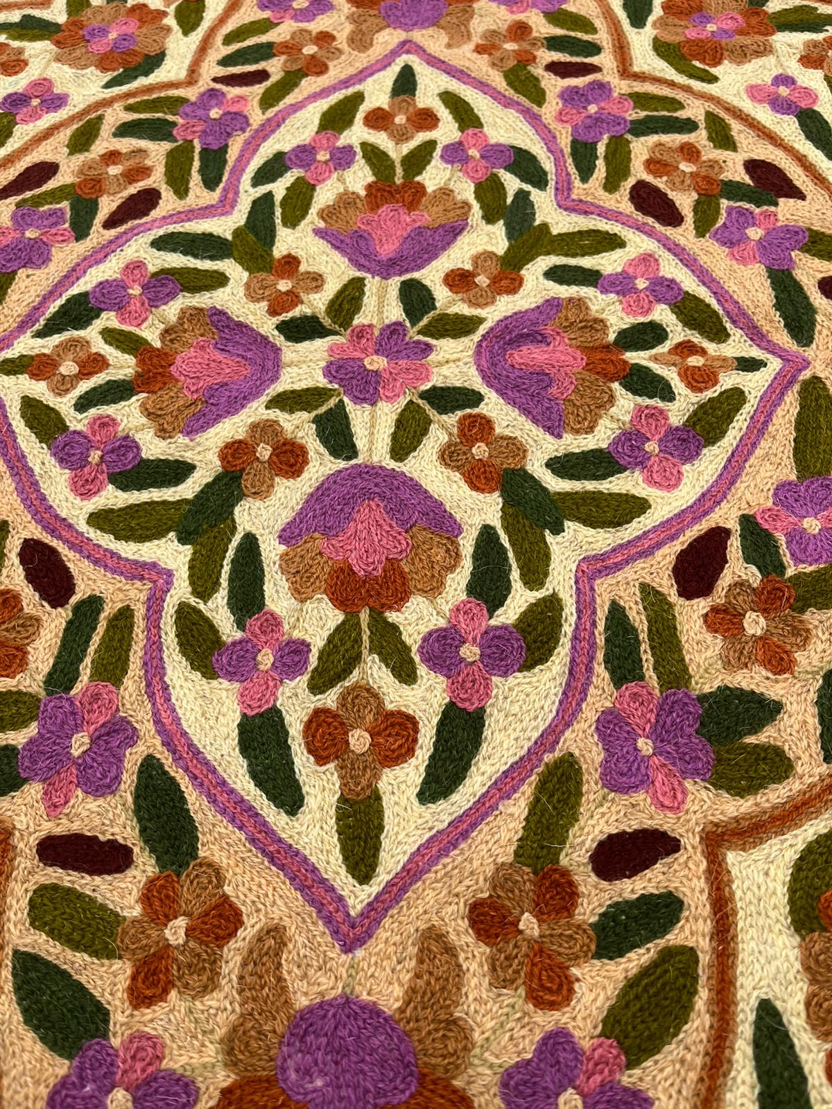 Na oferowanym przez nas dywanie kaszmirskim przedstawiony jest bogaty, symetryczny wzór kwiatowy i roślinny. Centralny medalion otoczony jest gęstym układem stylizowanych kwiatów i liści, rozchodzących się promieniście po całej powierzchni dywanu. Wzór ten charakteryzuje się dużą ilością detali i misternym wykonaniem. Dominują ciepłe odcienie w kolorze beżowym lub jasnokremowym oraz fiolet: lawendowy i ciemniejszy, a także róż, zieleń, brąz i pomarańczowy.