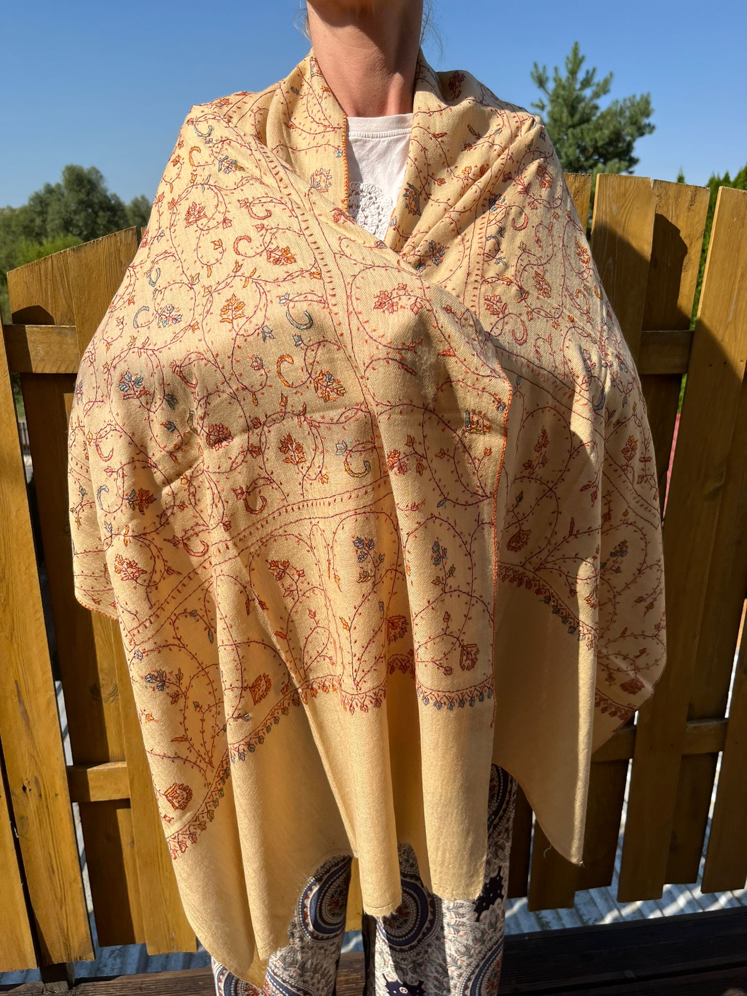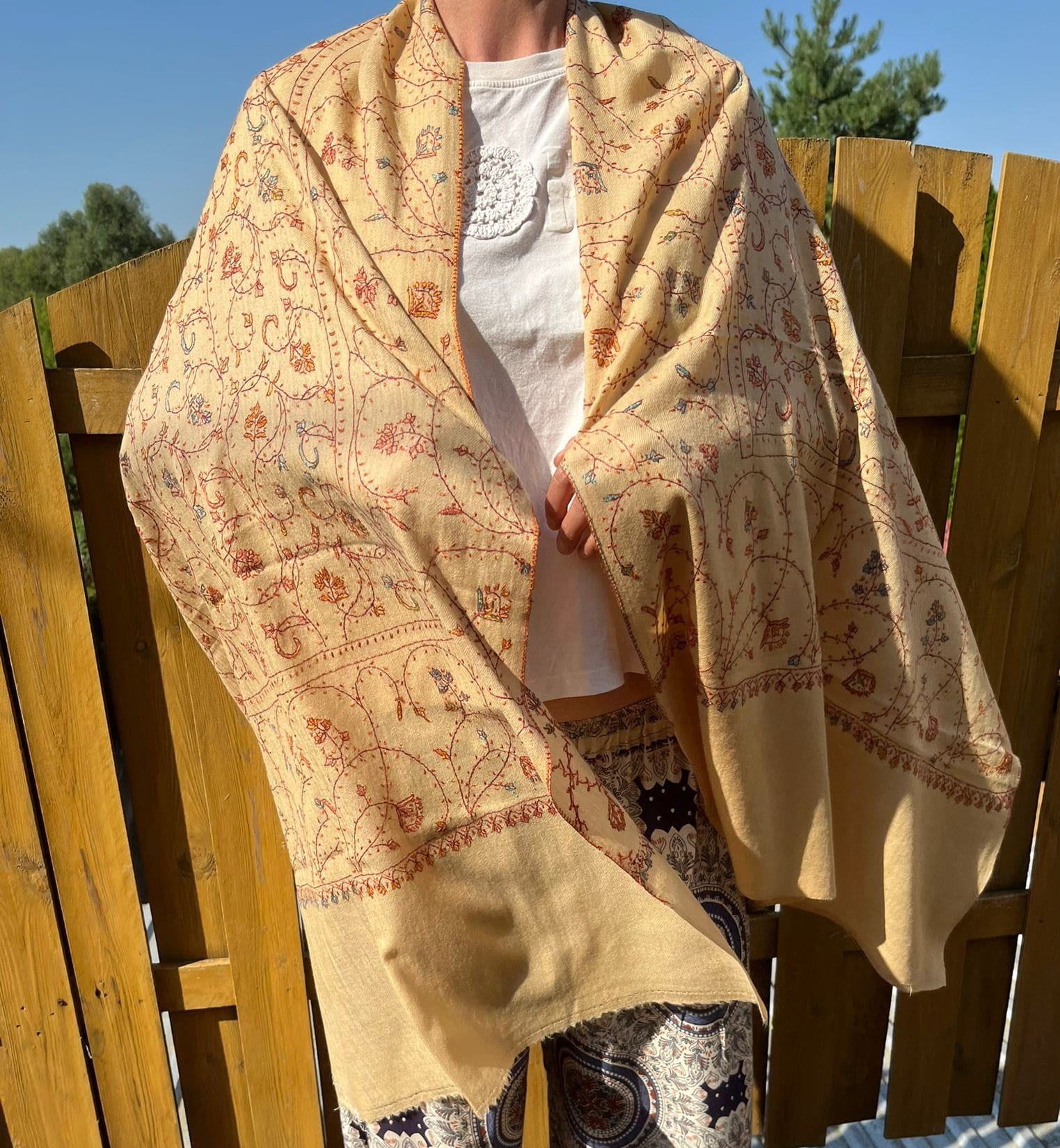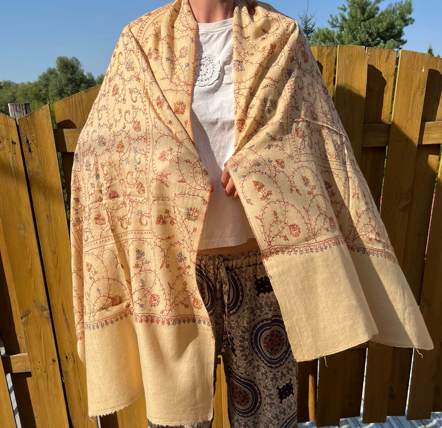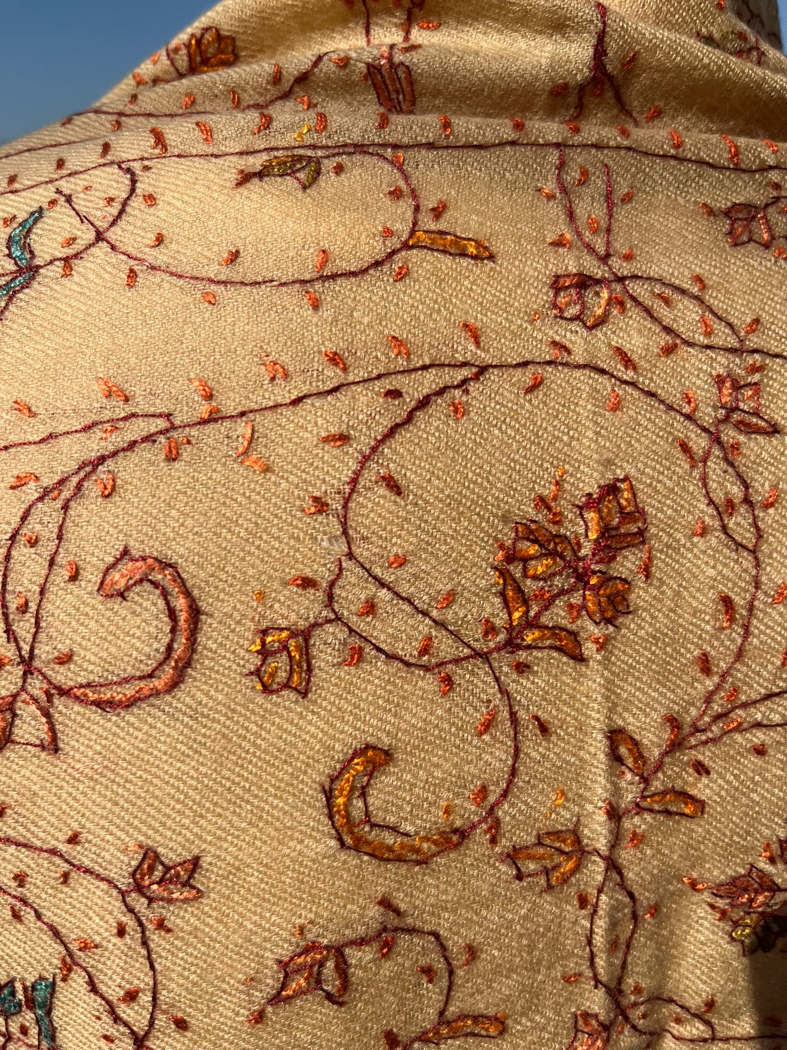 Szal kaszmirowy kremowy, haft