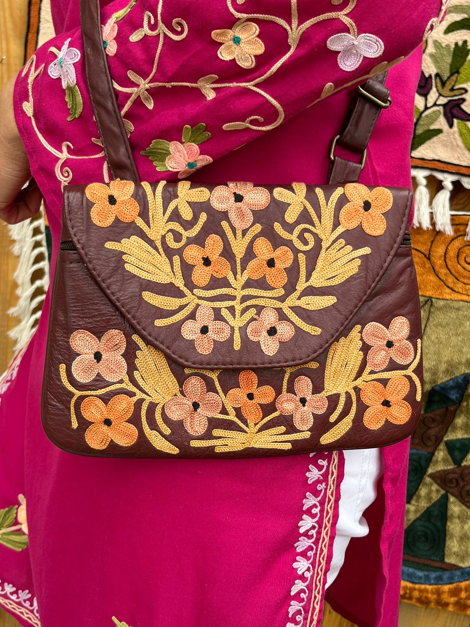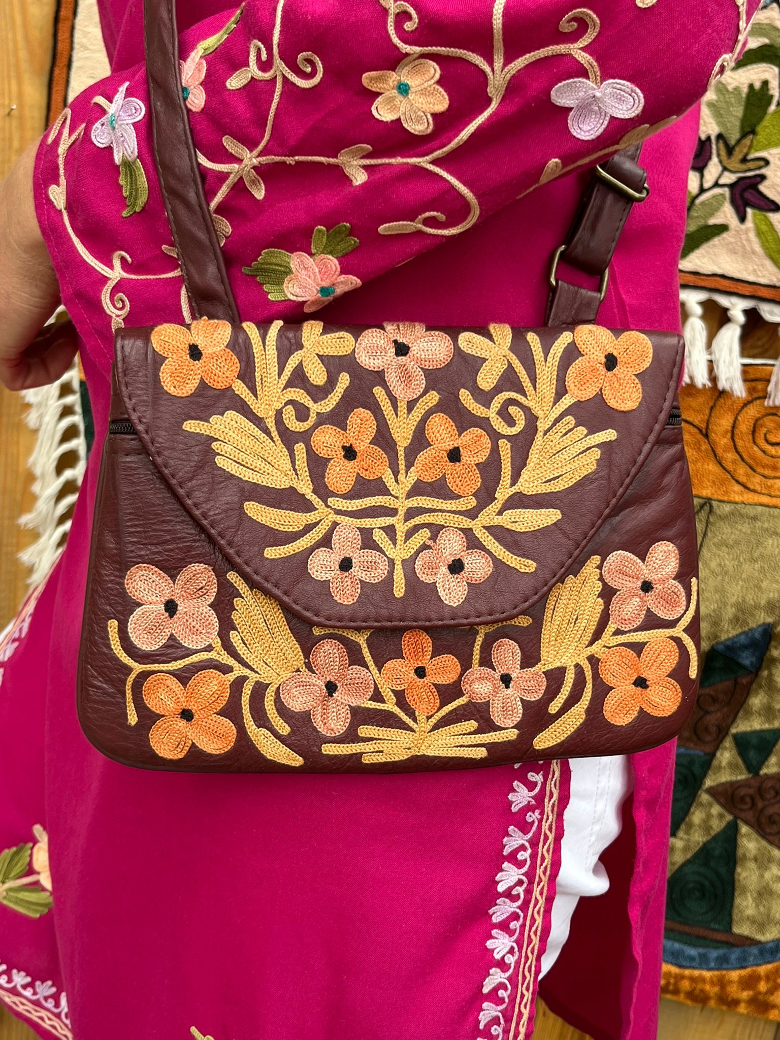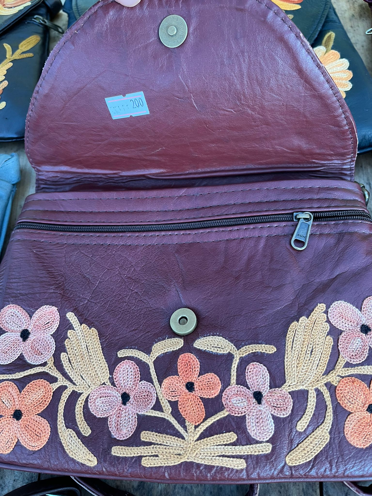 Torebka z unikalnym kaszmirskim haftem z motywami kwiatowymi, wykonana ręcznie z delikatnej naturalnej skóry /100% soft leather/ w małej manufakturze w Indiach, Tamilnadu. Wymiary torebki 22cm x 17cm.