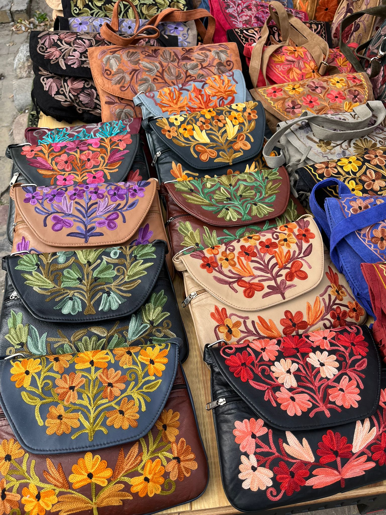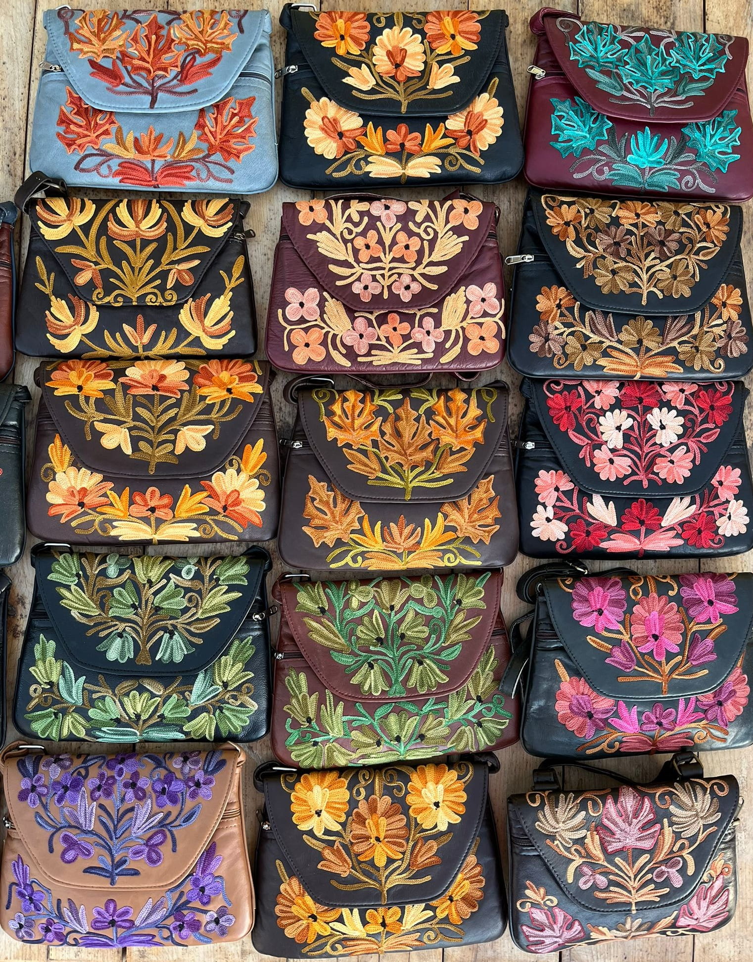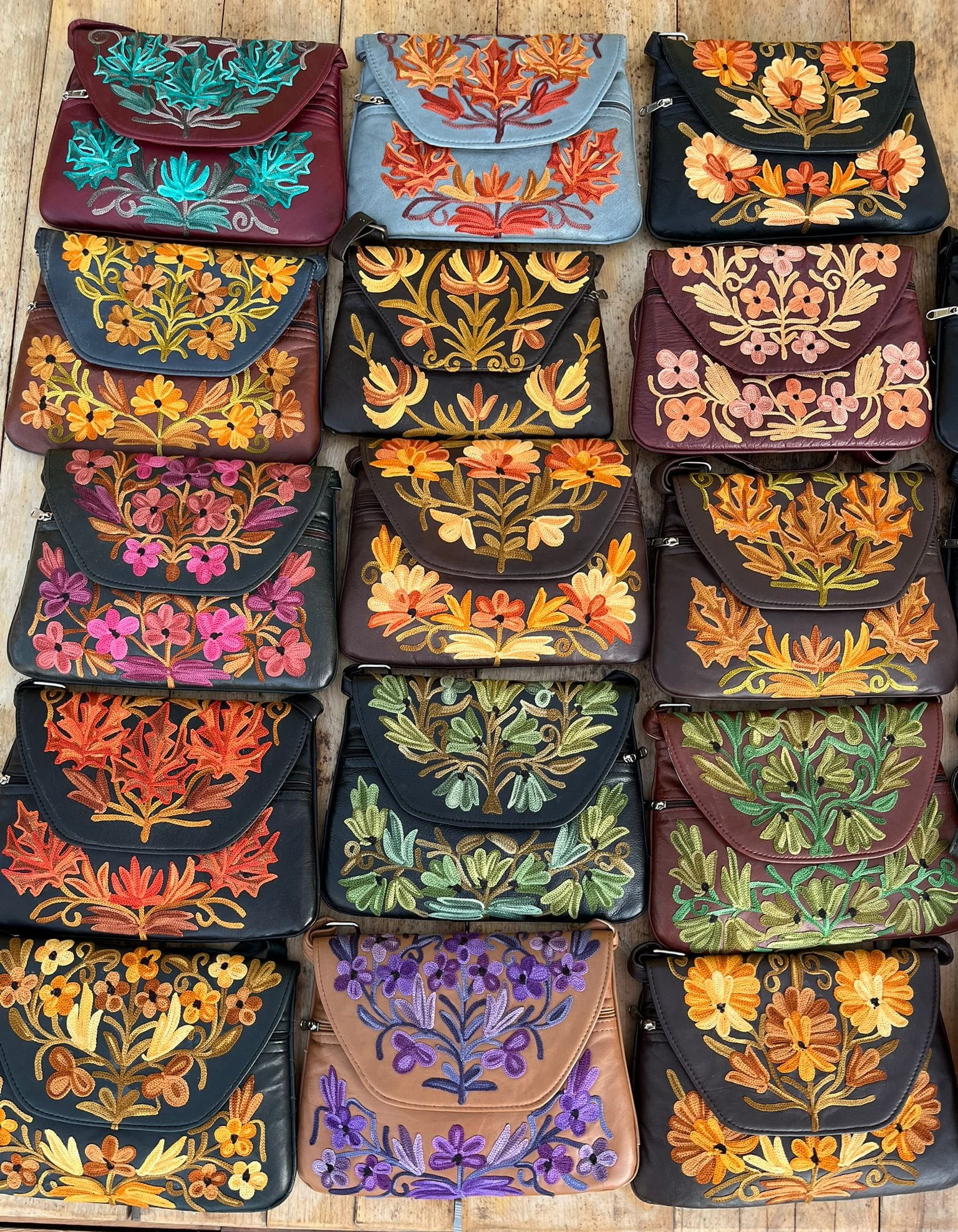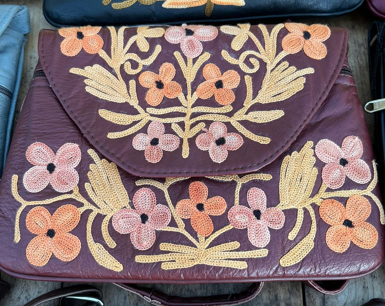 Torebka z unikalnym kaszmirskim haftem z motywami kwiatowymi, wykonana ręcznie z delikatnej naturalnej skóry /100% soft leather/ w małej manufakturze w Indiach, Tamilnadu. Wymiary torebki 22cm x 17cm.