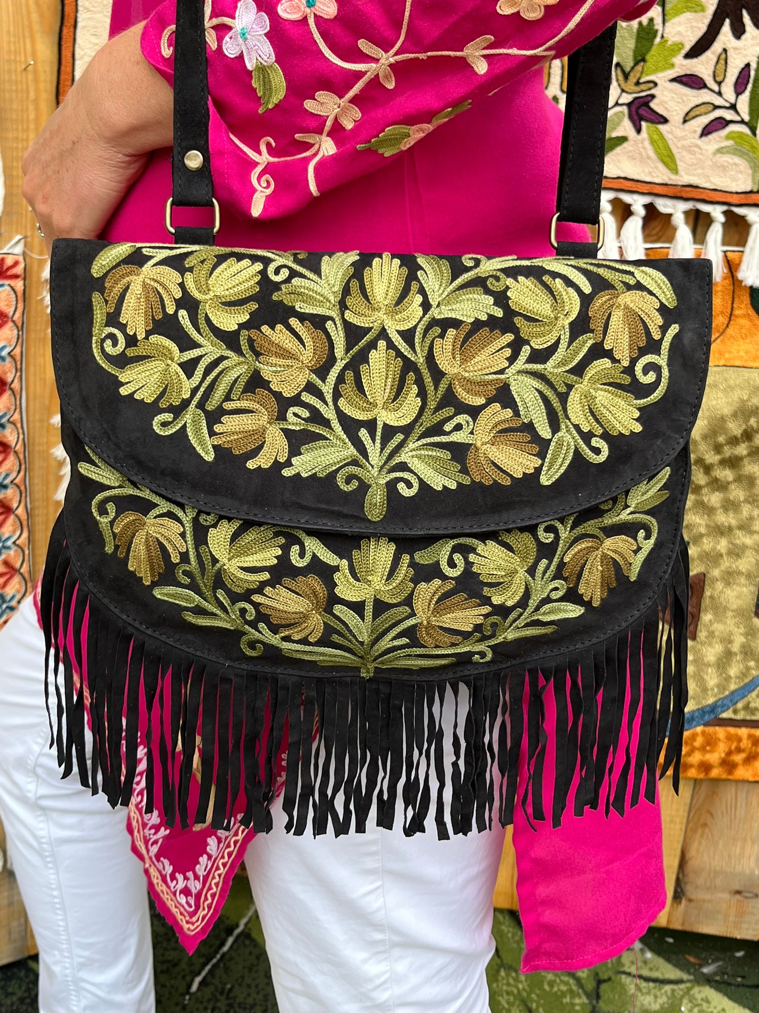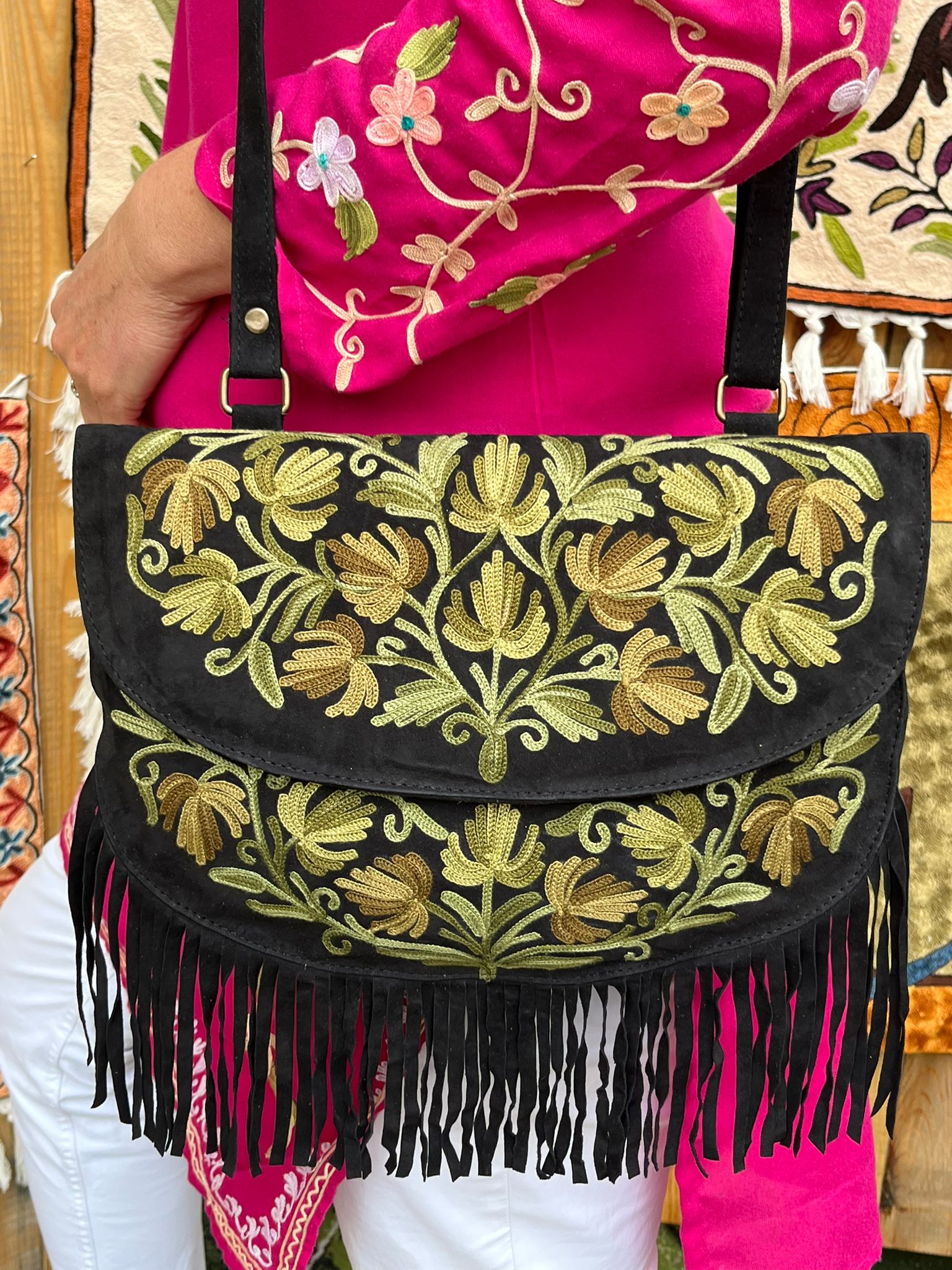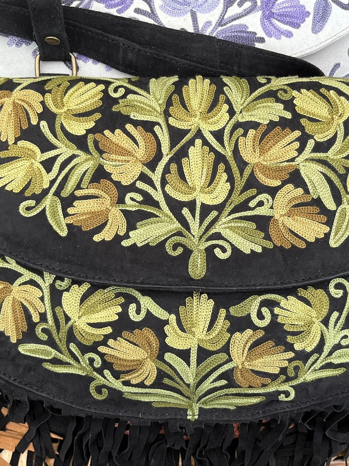 Torebka zamszowa boho czarna z zielonym haftem