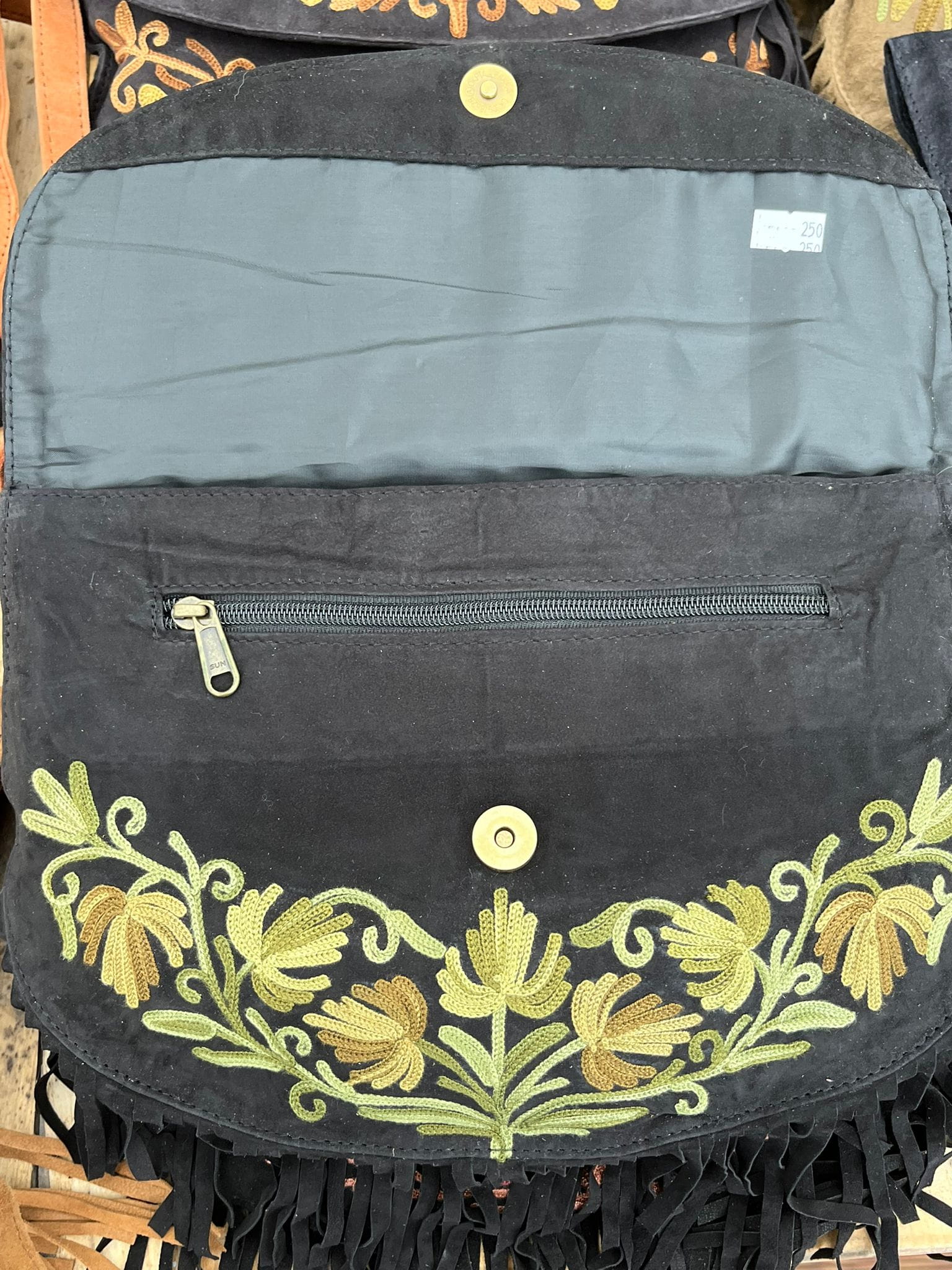Torebka zamszowa w stylu boho z haftem kaszmirskim, ręcznie wykonana przez lokalnych kaletników w Indiach, Tamilnadu, wymiary torebki 31cm x 22cm, posiada dwie kieszonki wewnętrzne na zamek