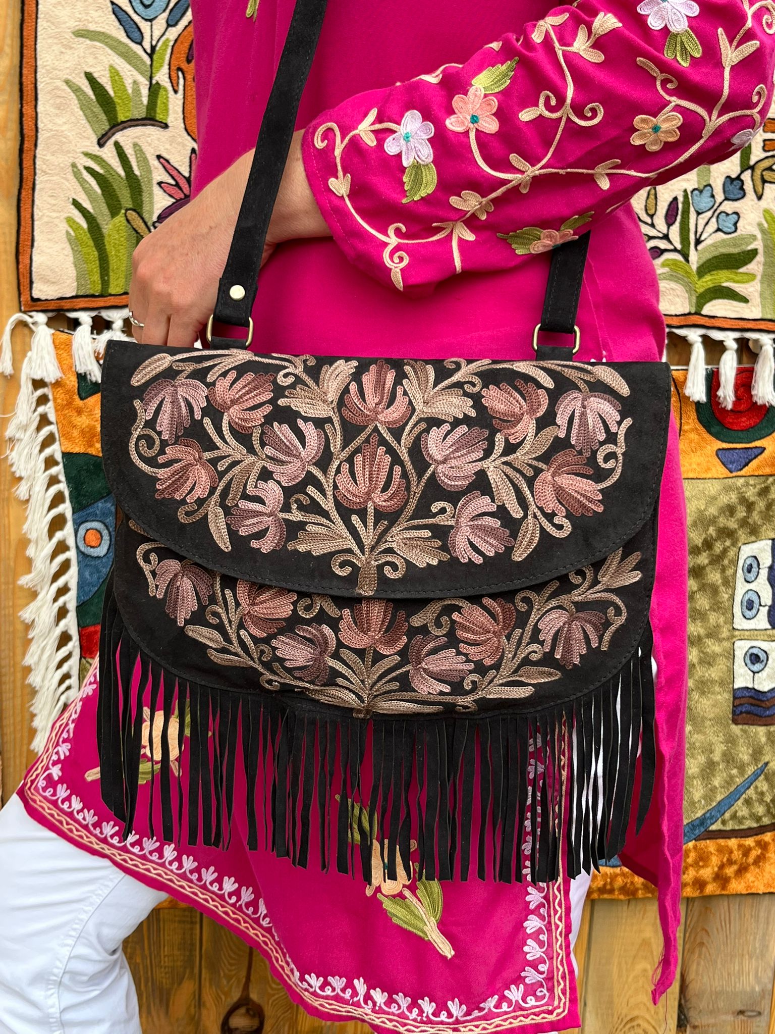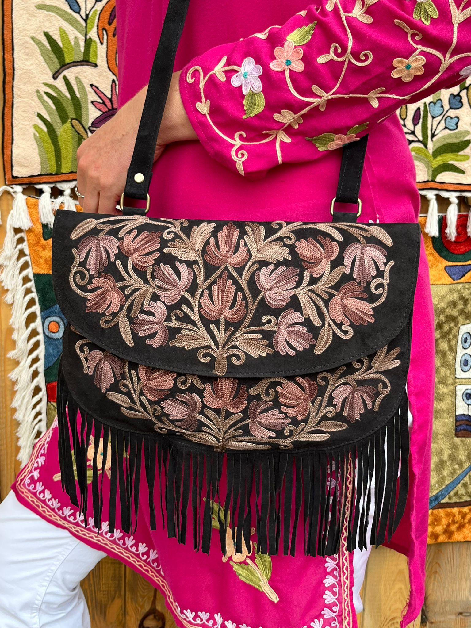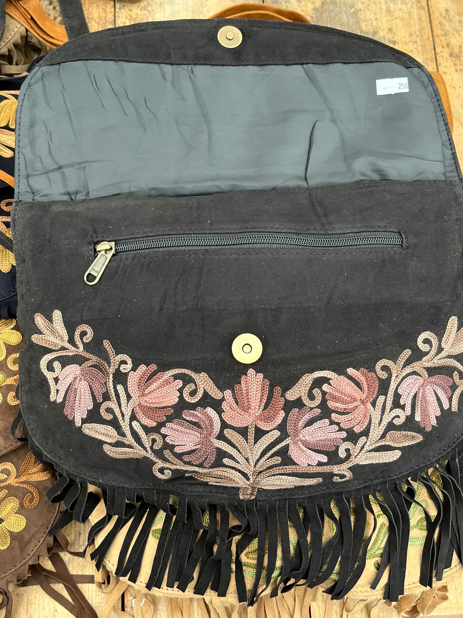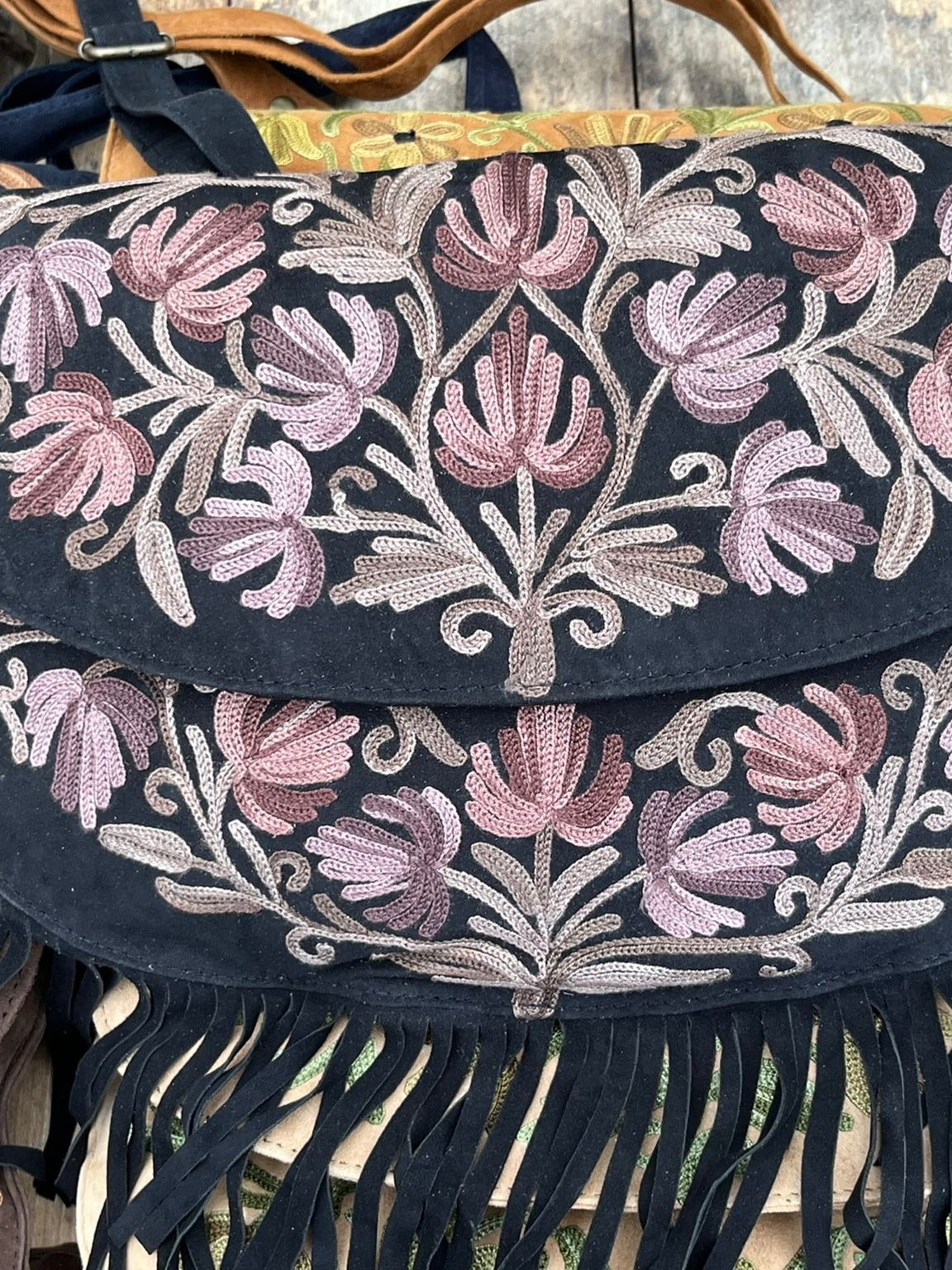Torebka zamszowa w stylu boho z haftem kaszmirskim, ręcznie wykonana przez lokalnych kaletników w Indiach, Tamilnadu, wymiary torebki 31cm x 22cm, posiada dwie kieszonki wewnętrzne na zamek