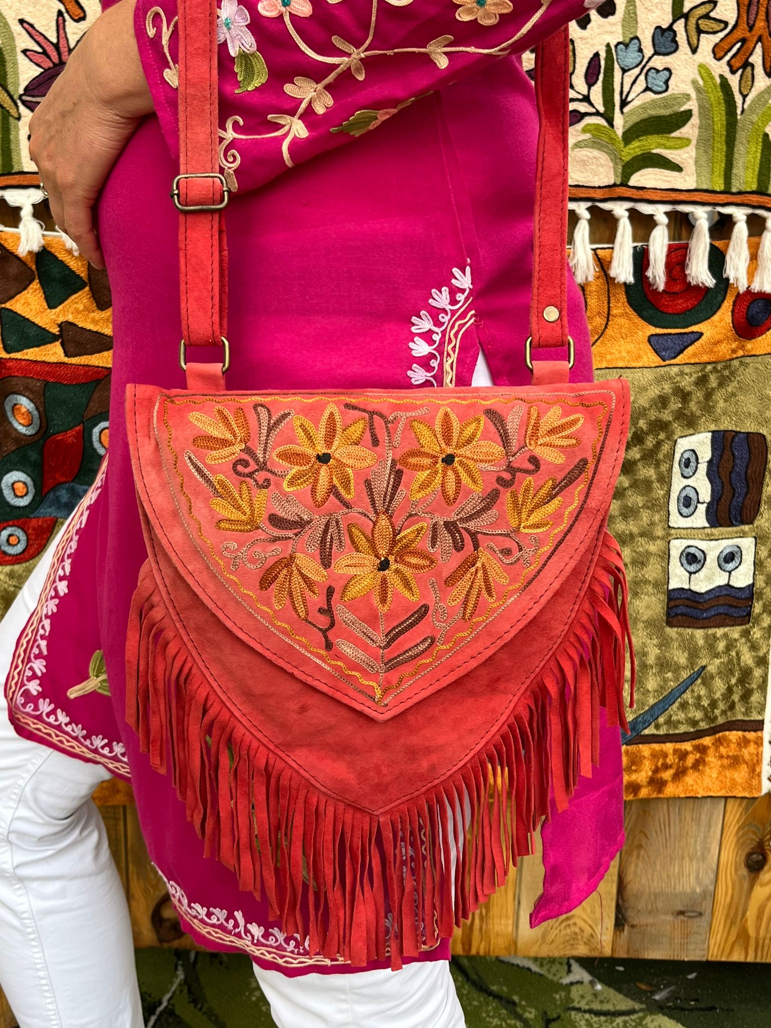 Torebka zamszowa w styly boho z haftem kaszmirskim, ręcznie wykonana przez lokalnych kaletników w Indiach, Tamilnadu, wymiary torebki 26cm x 25cm