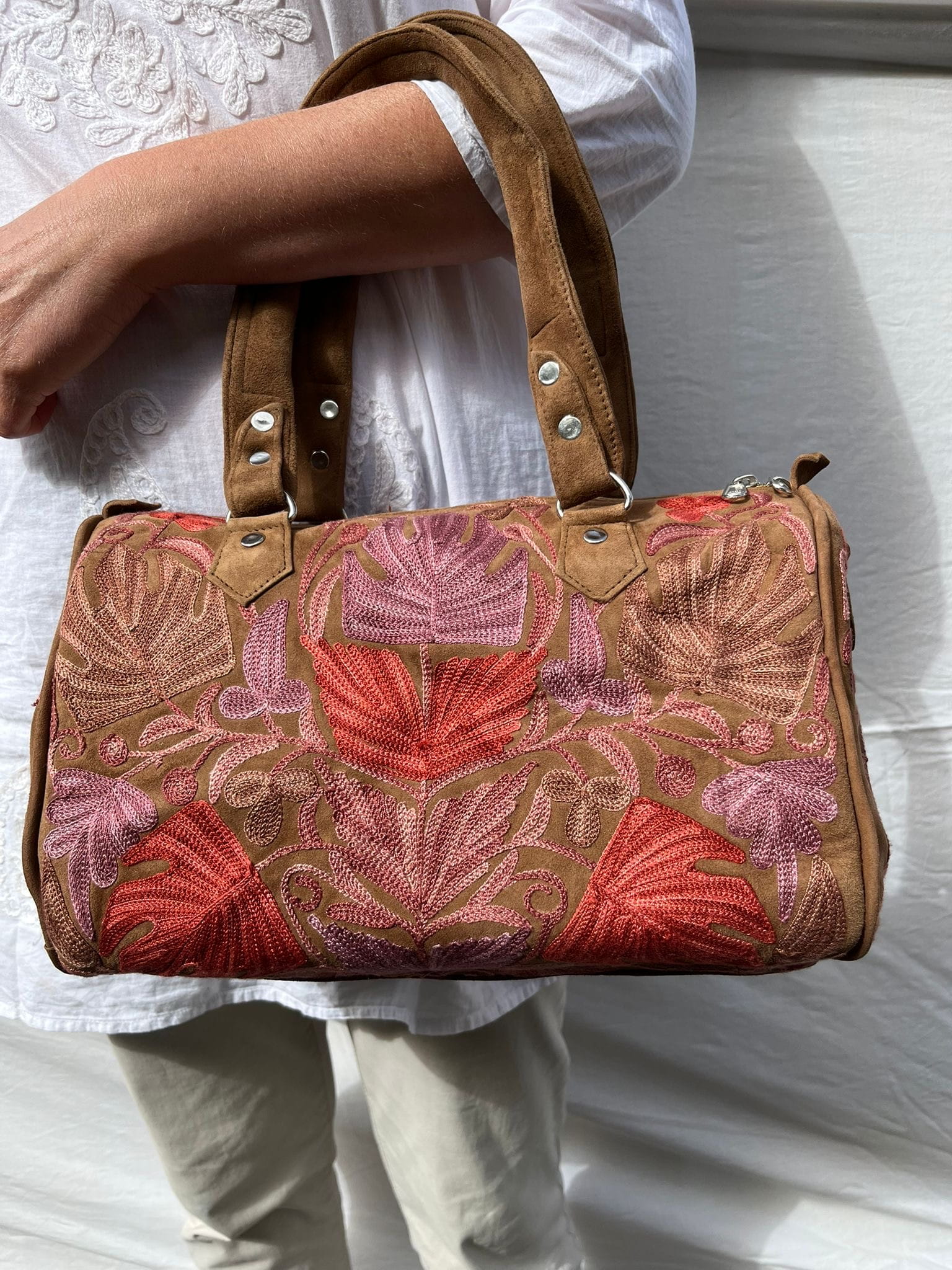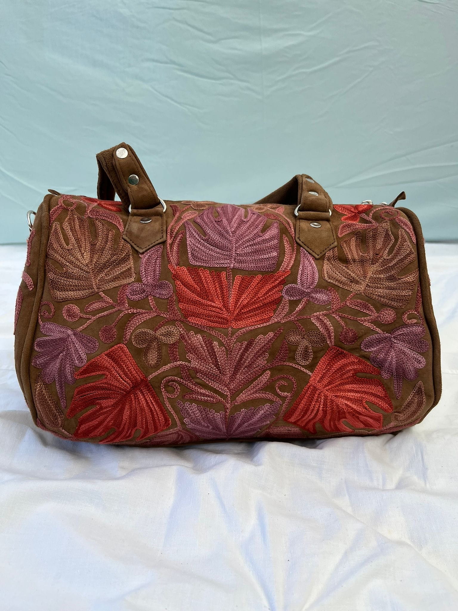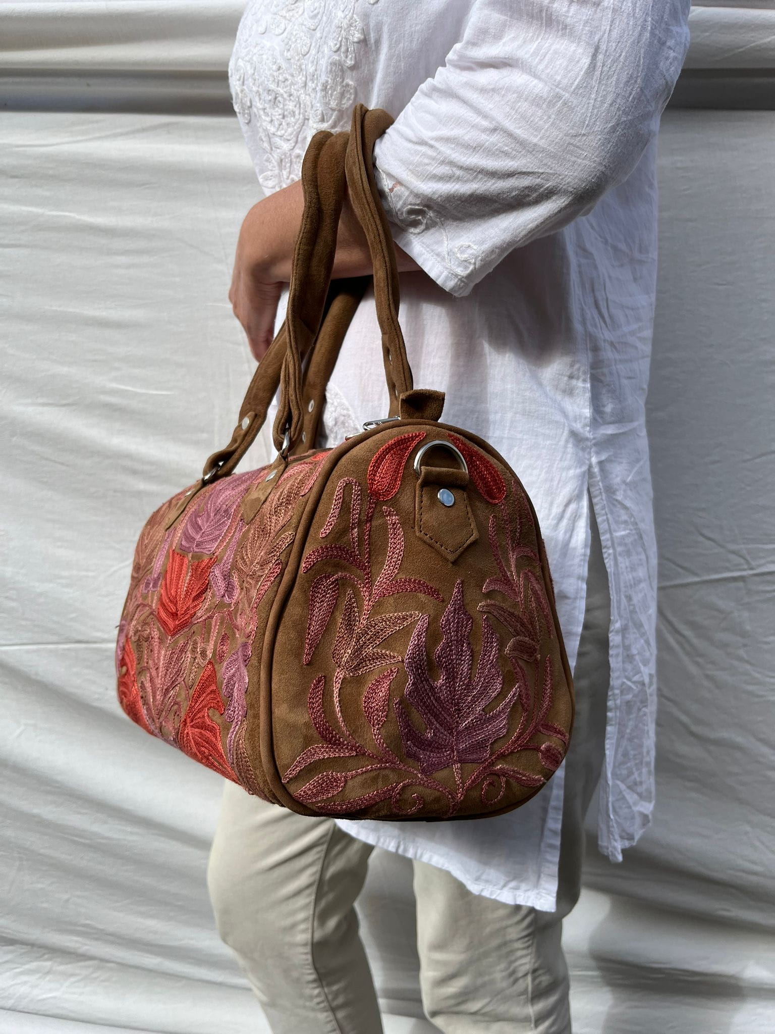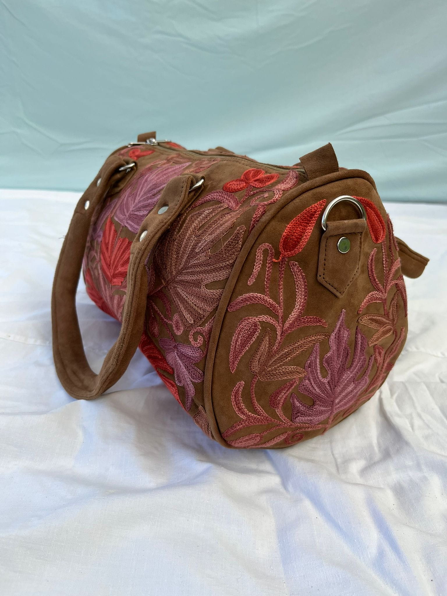 Torebka zamszowa/ kuferek ręcznie wykonana przez lokalnych kaletników w Indiach, Tamilnadu, haft kaszmirski, 100% zamsz naturalny,