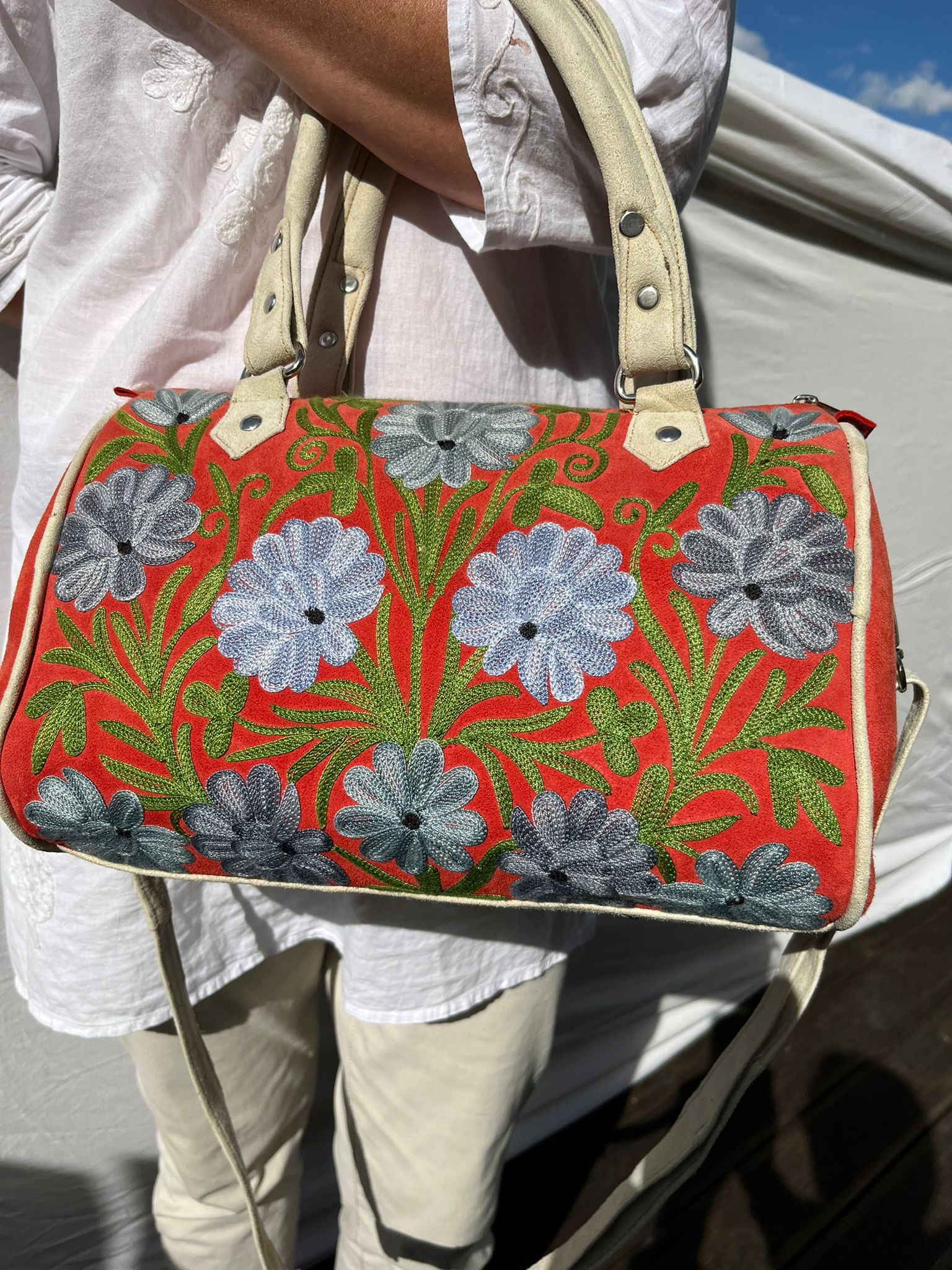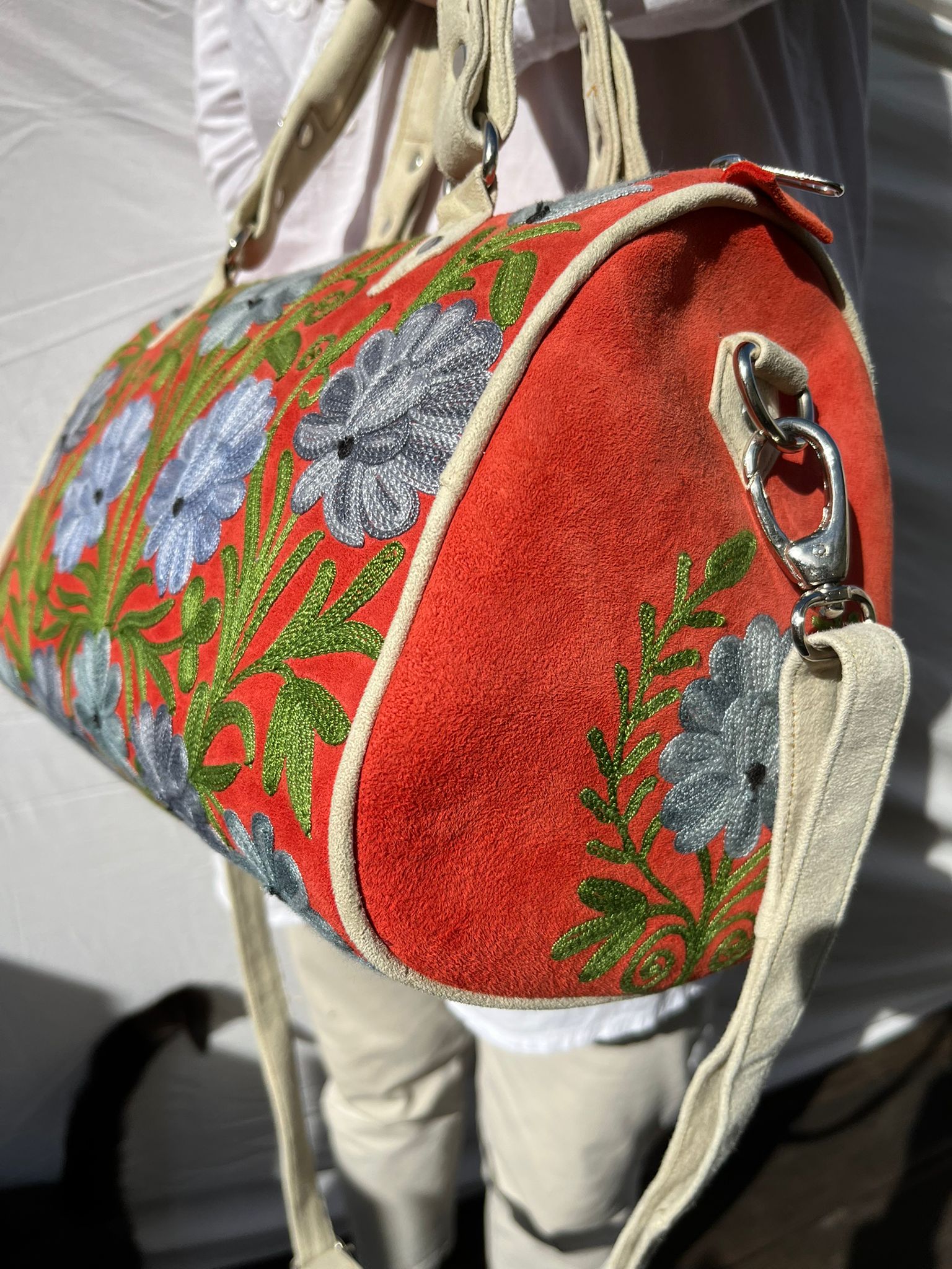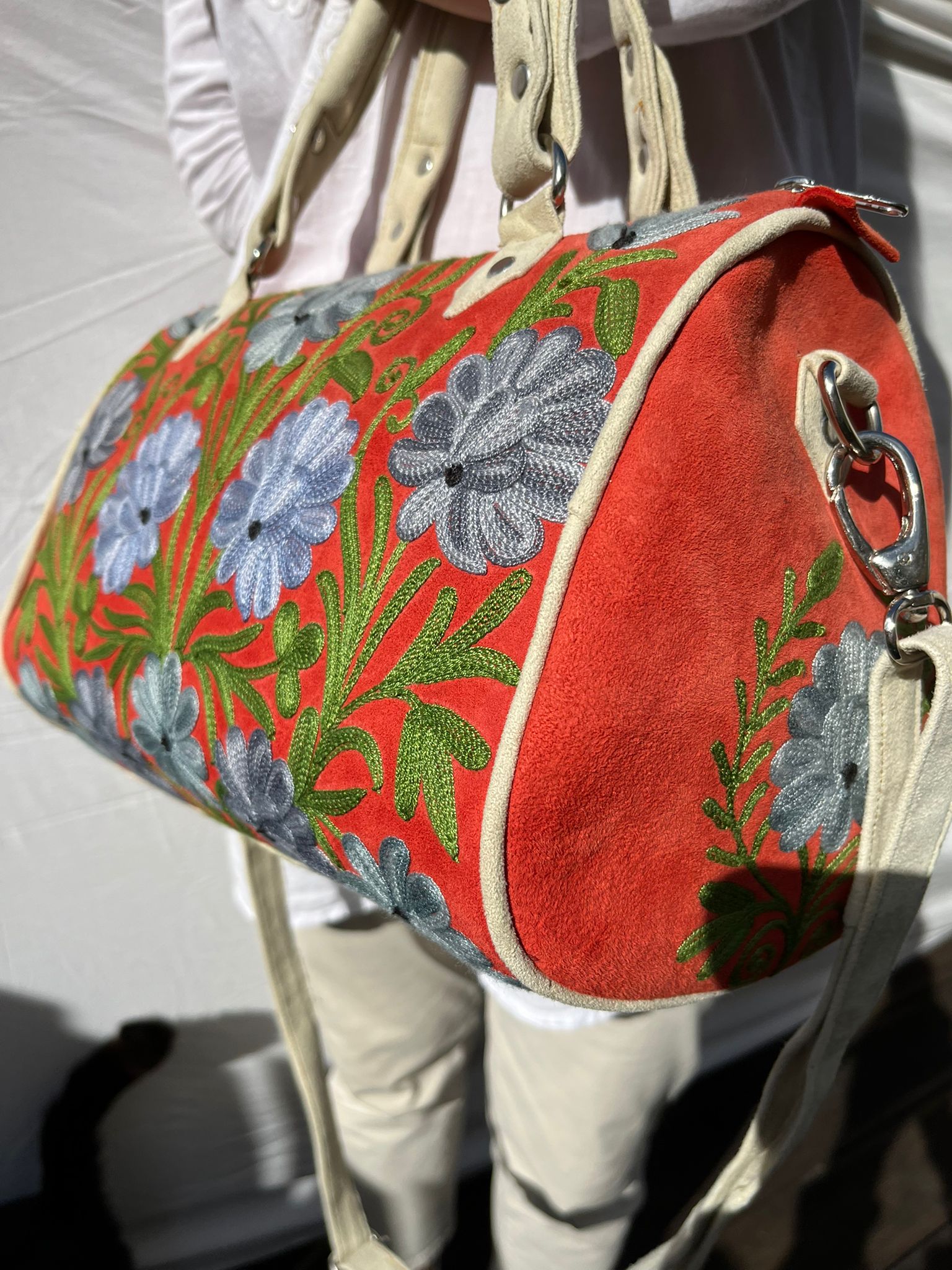 Torebka zamszowa/ kuferek ręcznie wykonana przez lokalnych kaletników w Indiach, Tamilnadu, haft kaszmirski, 100% zamsz naturalny,